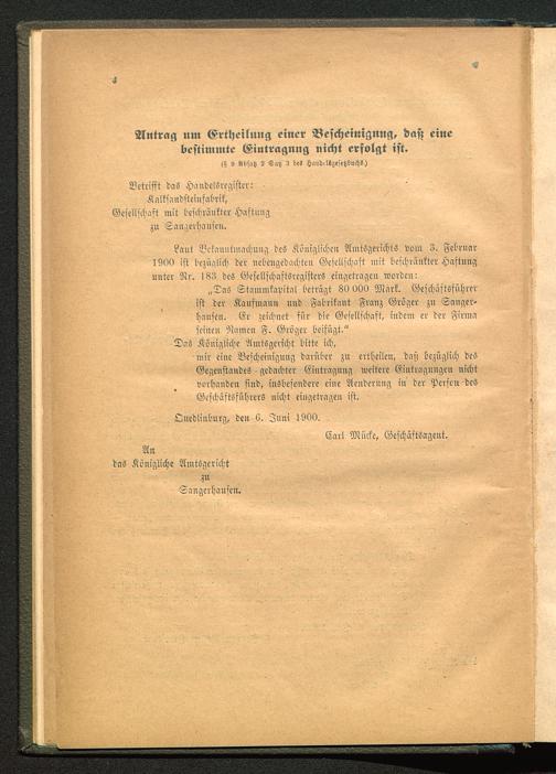 „Taö Stammkapital beträgt 80 000 Mark. Geschäftsführerist der Kaufmann uud Fabrikant Franz Gröger zu Sanger-hausen . Er zeichnet für die Gesellschaft, indem er der Firmaseinen Namen F. Gröger beifügt."Das Königliche Amtsgericht bitte ich,