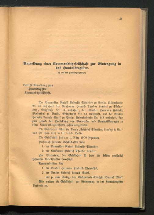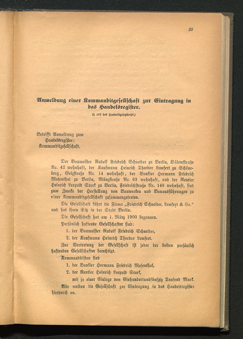 Der Baumeister Rudolf Friedrich Schneider zu Berlin , BnlowstraßeNr. 42 wohnhaft, der Kaufmann Heinrich Theodor Lemfert zu Schöne-berg , Golzstraße Nr. 14 wohnhaft, der Bankier Hermann FriedrichMosenthal zu Berlin , Münzstraße Nr. 63 wohnhaft, und der RentierHeinrich Leopold Stark zu Berlin , Friedrichstraße Nr. 148 wohnhaft, findzum Zwecke der Herstellung von Bauwerken und Bauausführungen zueiner Kommanditgesellschaft zusammengetreten.