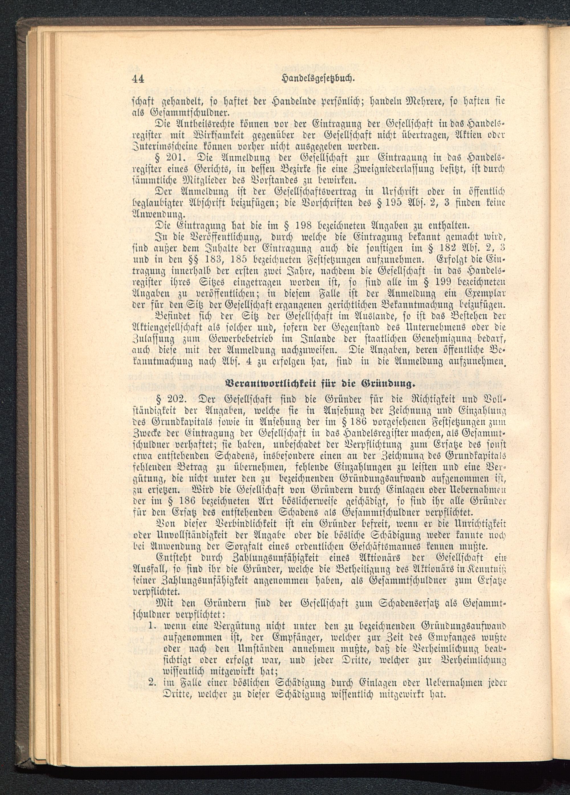 § 202. Der Gesellschaft sind die Gründer für die Richtigkeit und Voll-ständigkcit der Angaben, welche sie in Ansehung der Zeichnung und Einzahlungdes Grundkapitals sowie in Ansehung der im §186 vorgesehenen Festsetzungen znmZwecke der Eintragung der Gesellschaft in das Handelsregister machen, als Gesamint-schuldner verhaftet; sie haben, unbeschadet der Verpflichtung zum Ersatz? des sonstetwa entstellenden Schadens, insbesondere einen an der Zeichnung des Grundkapitalsfehlenden Betrag zn übernehmen, fehlende Einzahlungen zu leisten und eine Ver-gütung, die nicht uutcr den zu bezeichnenden GründungSaufwand aufgenommen ist,zu ersetzen. Wird die Gesellschaft von Gründern durch Einlagen oder Uebernahme nder im § 186 bezeichneten Art böslicherweisc geschädigt, so sind ihr alle Gründerfür den Ersatz des entstehenden Schadens als Gesammtschulduer verpflichtet.