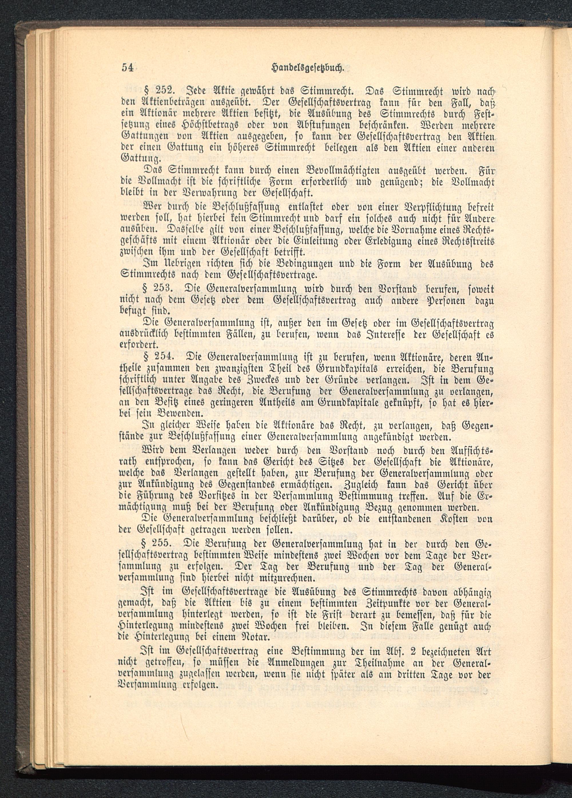 254. Die Generalversammlung ist zu berufen, wenn Aktionäre, deren An-theile zusammen den zwanzigsten Theil deS Grundkapitals erreichen, die Berufungschriftlich unter Angabe des Zweckes und der Gründe verlangen. Ist in dem Ge-sellschaftsvertrage das Recht, die Berufung der Generalversammlung zu verlangen,an den Besitz eines geringeren Antheils am Grundkapitale geknüpft, so hat es hier-bei sein Bewenden.