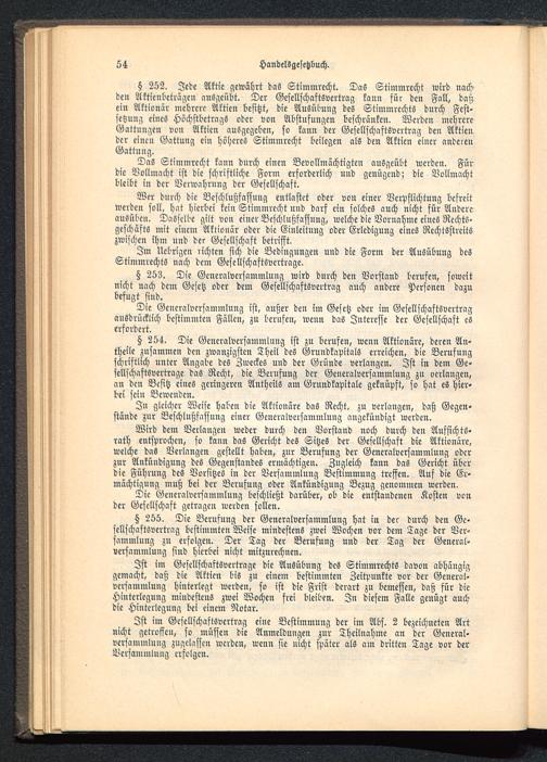 § 252. Jede Aktie gewährt das Stimmrecht. Das Stimmrecht wird nachden Aktienbcträgen ausgeübt. Der Gesellschaftsvertrag kann für den Fall^ daßein Aktionär mehrere Aktien besitzt, die Ausübung des Stimmrechts durch Fest-setzung eines Höchstbetrags oder von Abstufungen beschränken. Werden mehrereGattungen von Aktien ausgegeben, so kann der Gesellschaftsvertrag den Aktiender einen Gattung ein höheres Stimmrecht beilegen als den Aktien einer anderenGattung.