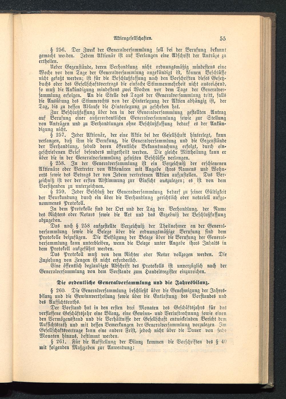 § 256. Der Zweck der Generalversammlung soll bei der Berufung bekanntgemacht weiden. Jedem Aktionär ist auf Verlangen eine Abschrift der Anträge zuertheilen.