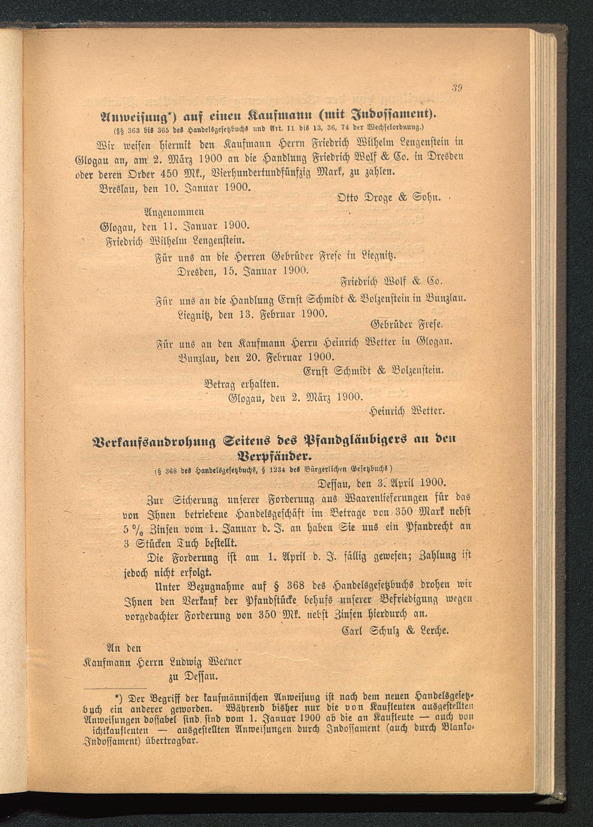 Wir weisen hiermit den Kaufmann Herrn Friedrich Wilhelm Lengensteiu inGlogau an, am 2. März 1900 an die Handlung Friedrich Wolf A Co. in Dresden oder deren Order 450 Mk., Vicrhundertundfünfzig Mark, zu zahlen.