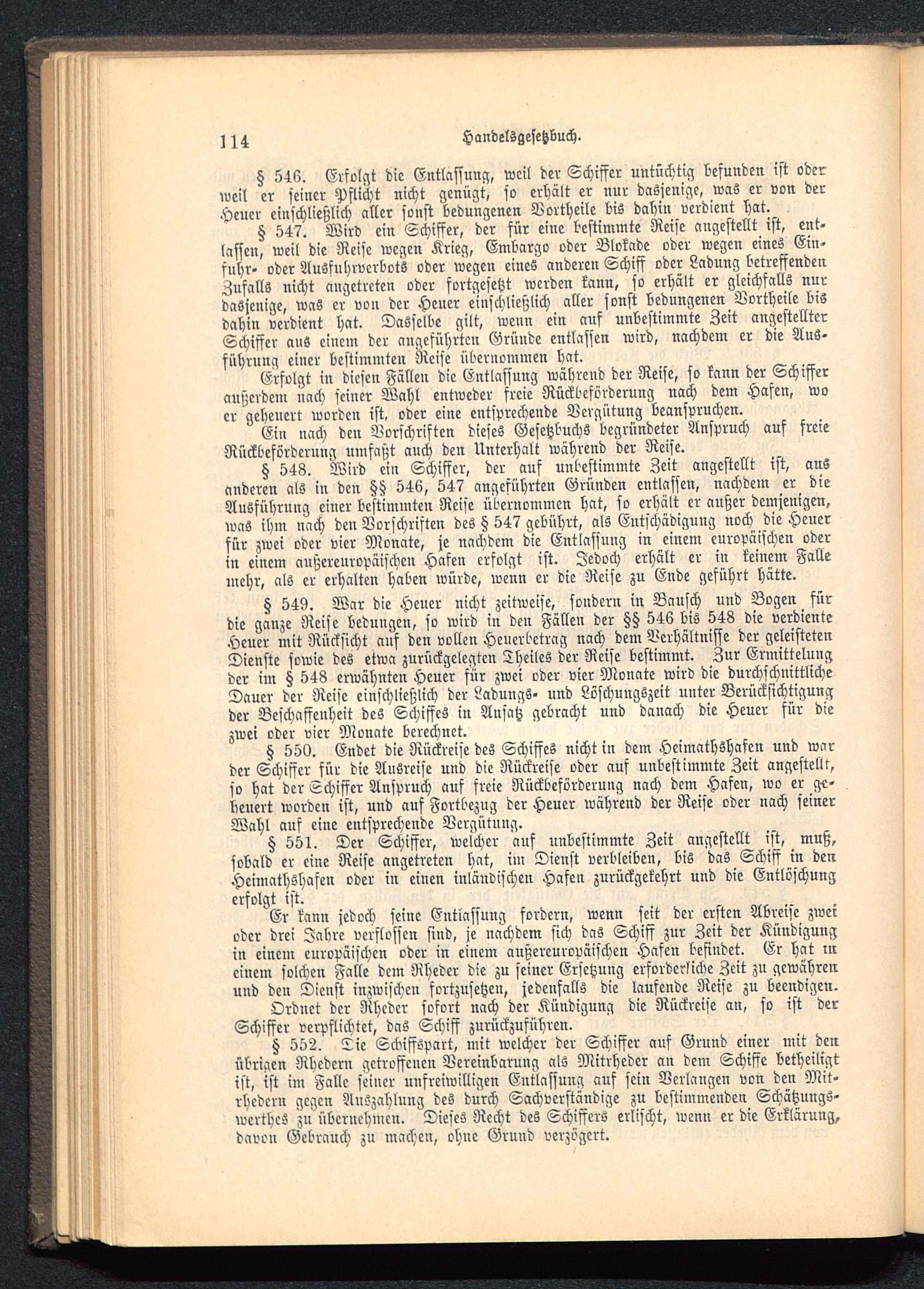 § 551. Der Schiffer, welcher auf unbestimmte Zeit angestellt ist, muß,sobald er eine Reise angetreten hat, im Dienst verbleiben, bis das Schiff in denHeimathshafen oder in einen inländischen Hafen zurückgekehrt und die Entlöschungerfolgt ist.