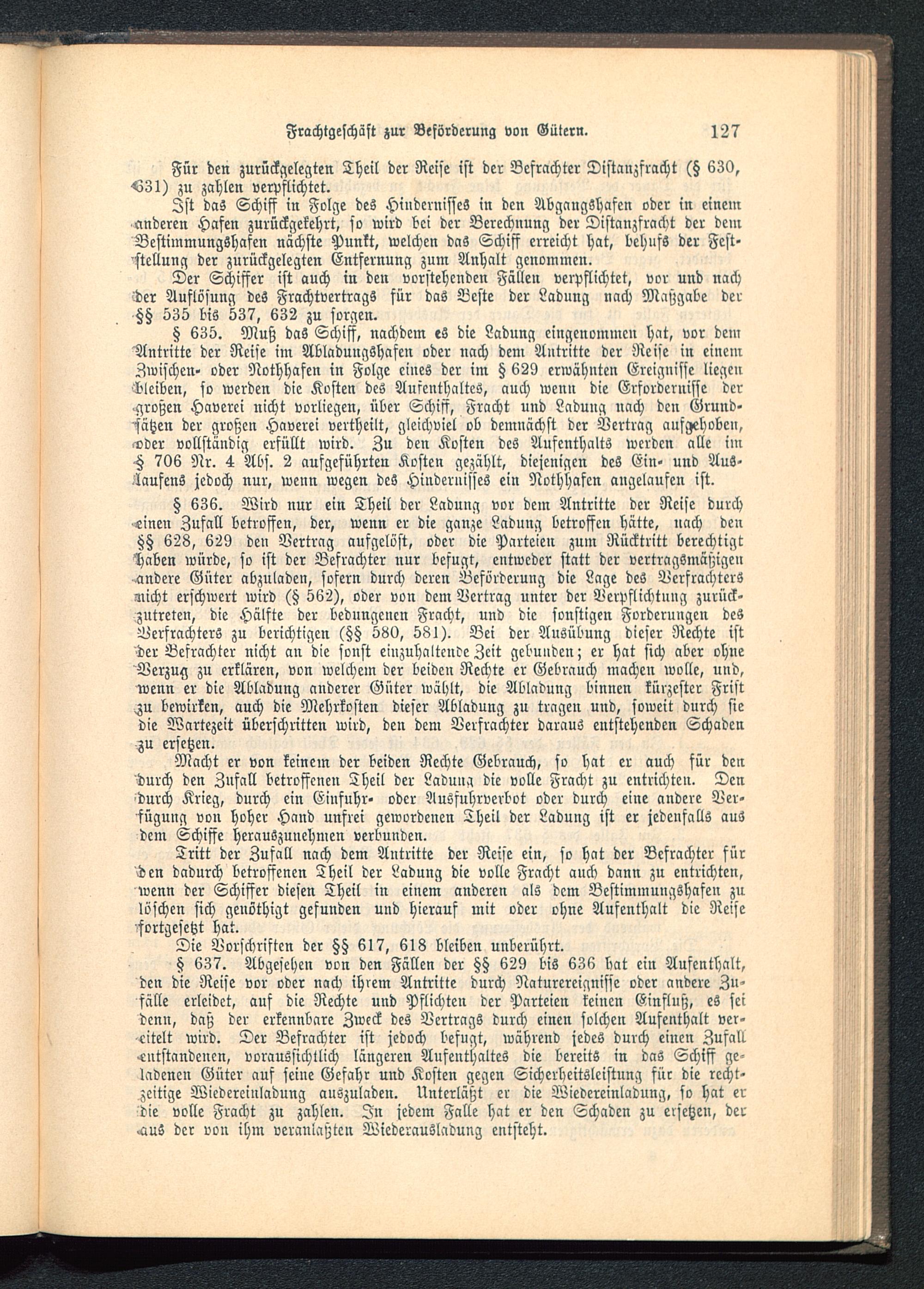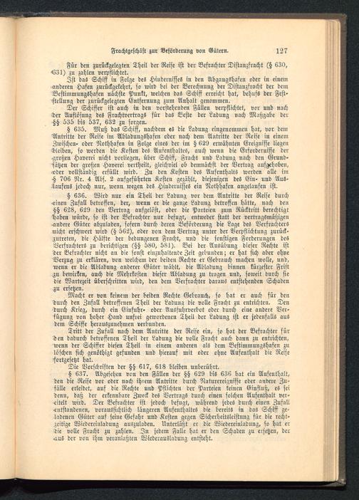 5 637. Abgesehen von den Fällen der tztz 629 bis 636 bat ein Aufenthalt,den die Reise vor oder nach ihrem Antritte durch Naturereignisse oder andere Zu-fälle erleidet, auf die Rechte und Pflichten der Parteien reinen Einfluß, es seidenn, daß der erkennbare Zweck des Vertrags durch einen solchen Aufenthalt ver-eitelt wird. Der Befrachter ist jedoch befugt, während jedes durch einen Zufall.entstandenen, voraussichtlich längeren Aufenthaltes die bereits in das Schiff ge-ladenen Güter auf seine Gefahr und Kosten gegen Sicherheitsleistung für die recht-zeitige Wiedercinladung auszuladen. Unterläßt er die Wiedereinladung, so hat erdie volle Fracht zu zahlen. In jedem Falle hat er den Schaden zu ersetzen, der^iuS der von ihm veranlaßten Wiederausladung entsteht.