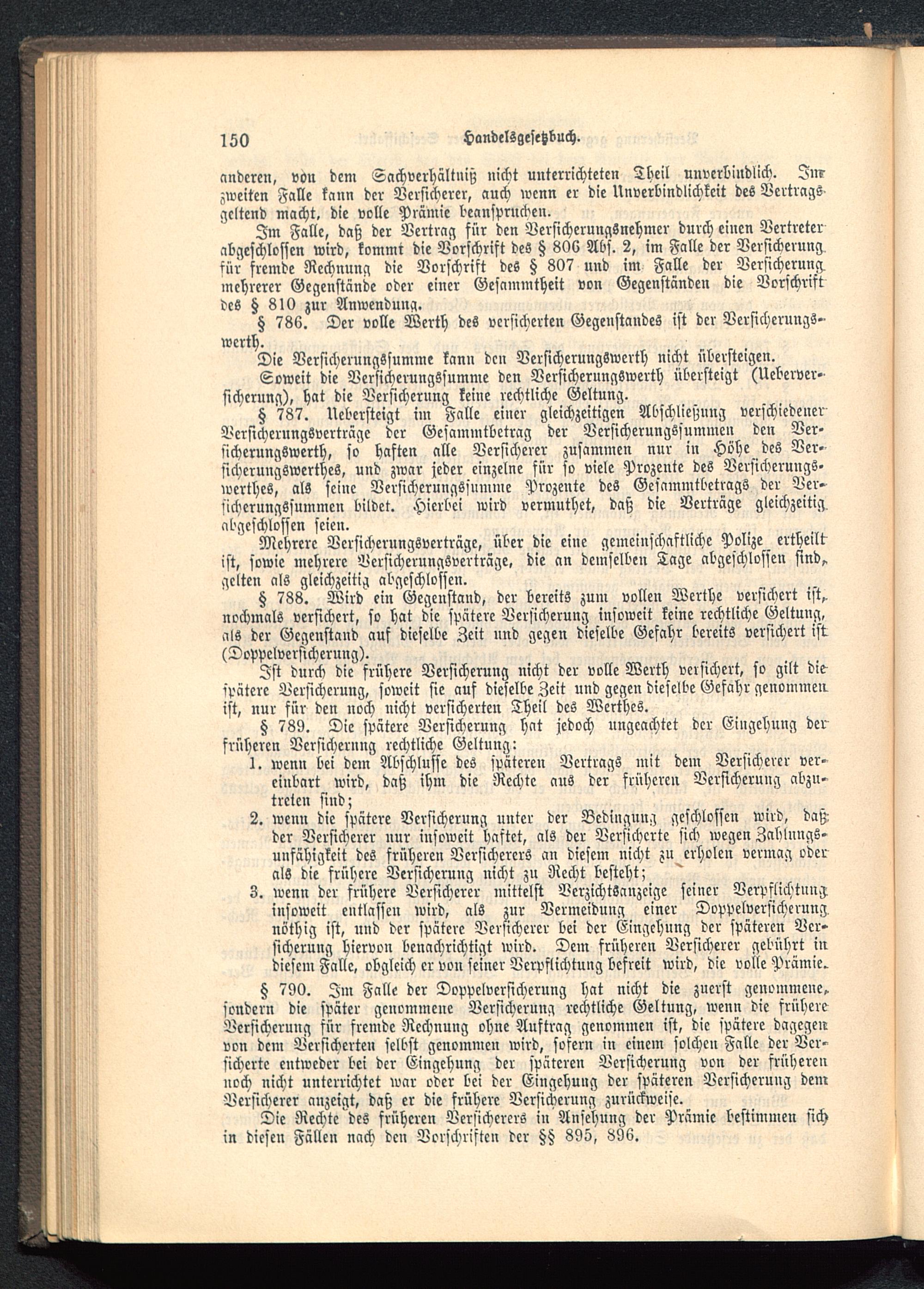 § 788. Wird ein Gegenstand, der bereits zum vollen Werthe versichert ist,,nochmals versichert, so hat die spätere Versicherung insoweit keine rechtliche Geltung,als der Gegenstand auf dieselbe Zeit und gegen dieselbe Gefahr bereits versichert ist.(Doppclversicherung).