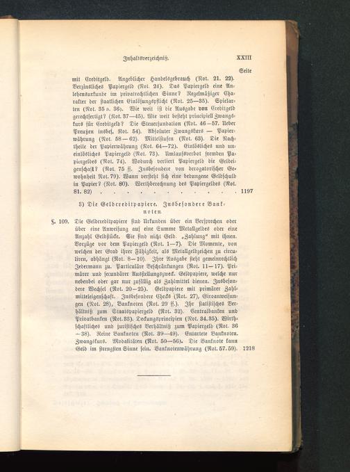 8. 109. Die Gcldcreditpapiere sind Urkunden über ein Versprechen oderüber eine Anweisung auf eine Summe Metallgeldes oder eineAnzahl Geldstücke. Sie sind nicht Geld. „Zahlung" mit ihnen.Vorzüge vor dem Papiergeld (Not. 1—7). Die Momente, vonwelchen der Grad ihrer Fähigkeit, als Metallgeldzeichen zu circu-liren, abhängt (Not. 8—10). Ihre Ausgabe steht gemeinrechtlichJedermann zu. Particuläre Beschränkungen (Not. 11—17). Pri-märer und secundärer Ausstellungszweck. Geldpapiere, welche nurnebenbei oder gar nur zufällig als Zahlmittel dienen. Insbeson-dere Wechsel (Not. 20—25). Geldpapiere mit primärer Zahl-miltcleigcnschaft. Insbesondere Checks (Not. 27), Giroanweisun-gen (Not. 28), Banknoten (Not. 29 ff.). Ihr statistisches Ver-hältniß zum Staatspapiergeld (Not. 32). Centralbanken undPrivatbanken (Not. 33). Deckuugsprincipien (Not. 34.35). Wirth-schaftliches uud juristisches Verhältniß zum Papiergeld (Not. 36— 38). Reine Banknoten (Not. 39—49). Entartete Banknoten.Zwangsknrö. Modalitäten (Not. 50—56). Die Banknote kannGeld im strengsten Sinne sein. Banknolenwährung (Not. 57.59). 1213