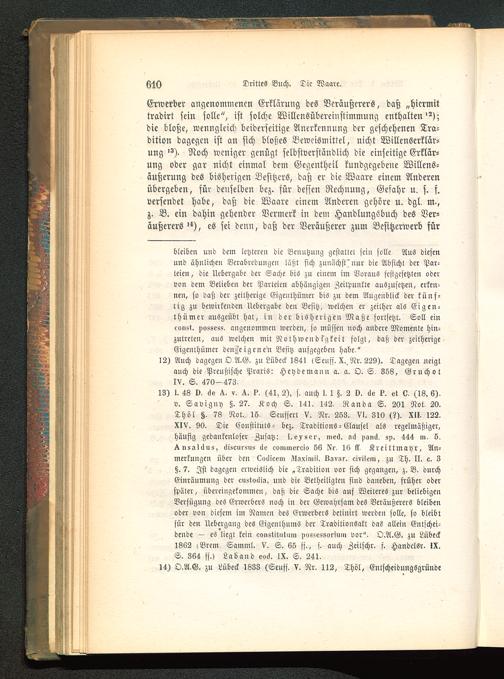 13) I. 43 0, ae .4. v, ?. (41, 2), f. auch I. 1 §. 2 0. (i<- ?. «t l), (18. 6).v. Saviguy §. 27. Koch S. 141. 142, Randa S. 201 Not, 20.Thöt §, 78 Not., IS, Senffert V. Nr. 253. VI. 310 (?). XII. 122.XI V. 90. Die Eonstitnts- bez. Traditions - Clausel als regelmäßiger,hänfig gedankenloser Zusatz: I^e^ser, med. «ck psnck, sn. 444 in, 5,>nsal>lns, lliseursu« <Io eommereio 56 IVr, 16 ik, Kreittmayr, An-merkungen über den Loilicem Aliiximi!, k.ivsr. eivi>>.-in, zu Th. II. c. 3§. 7. Ist dagegen erweislich die „Tradition vor sich gegangen, z. B. durchEinräumung der c»5to«lig, und die Betheiligten sind daneben, früher oderspäter, übereingekommen, daß die Sache bis ans Weiteres znr beliebigenVerfügung des Erwerbers noch in der Gewahrsam des Veräußerers bleibenoder von diesem im Namen des Erwerbers dclinirt werden solle, so bleibtfür den Uebergang des Eigenthums der Traditionsatt das allein Entschei-dende — es liegt kein constitutmn po«svs8orium vor". O.A.G. zu Lübeck 1862 lBrem Samml. V. S. 65 ff., f. anch Zeitschr. f. Handelsr. IX.S. 364 ff.» Lab and eoil. IX. S. 241.