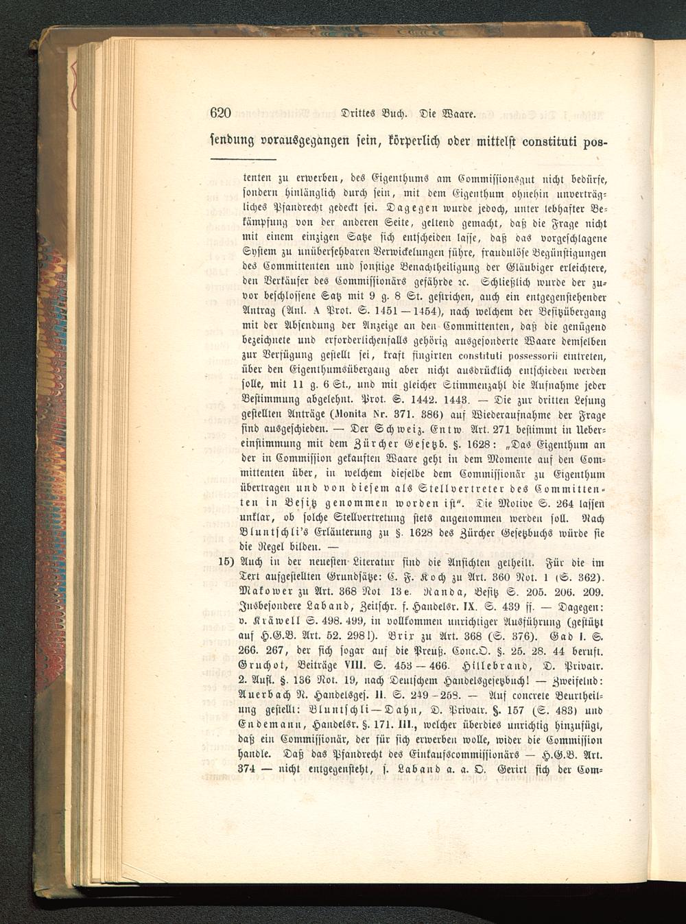 lenten zu erwerben, des Eigenthums am Commissionsgnt nicht bedürfe,sondern hinlänglich durch sein, mit dem Eigenthum ohnehin nnvcnräg-liches Pfandrechi gedeckt sei. Dagegen wurde jedoch, unter lebhafter Be-kämpfung von der anderen Seite, geltend gemacht, daß die Frage nichtmit einem einzigen Satze sich entscheiden lasse, daß oas vorgeschlageneSystem zu unübersehbaren Verwickelungen sichre, fraudnlöse Begünstigungendes Cvmmillenten und sonstige Benachtheiligung der Gläubiger erleichtere,den Verkäufer des Kommissionärs gefährde :c. Schließlich wurde der zu-vor beschlossene Satz mit 9 g. 8 St. gestrichen, auch ein entgegenstehenderAntrag (Anl. .X Prot. S. 1451 — 1454), nach welchem der Besitzübergangmit der Absenkung der Anzeige an den Committenten, daß die genügendbezeichnete und erforderlichcnsalls gehörig ausgesonderte Waare demselbenzur Verfügung gestellt sei, krast fingirien c>„>st>tuli >>»55«>ssorn eintreten,über den Eigenthumöübergang aber nicht ausdrücklich entschieden werdensolle, mit 11 g. 6 St., und mit gleicher Slimmenzahl die Aufnahme jederBestimmung abgelehnt. Prot. S. 1442. 1443. — Die zur drillen Lesunggestellten Anträge (.Uonit-l kr. 371. 386) aus Wiederausnahmc der Fragesind ausgeschieden. — Der Schweiz . Entw Art. 271 bestimmt in Ueber-einstimmung mir dem Zürcher Gesetzb. H. 1623: „Das Eigenthum ander in Commission gekanfteu Waare geht in dem Momente auf den Com-mittenten über, in welchem dieselbe dem Commissionär zu Eigenthumübertragen und von diesem als Stellvertreter des Committen-ten in Besitz genommen worden ist". Die Motive S. 264 lassenunklar, ob solche Stellvertretung stets angenommen werden soll. StachBluntschli's Erläuterung zu z, 1628 des Zürcher Gesetzbuchs würde siedie Regel bilden. —Ib) Auch iu der neuesten Literatur sind die Ansichten getheilt. Für die imText ausgestellten Grundsätze: C. F. Koch zu Art. 360 Not. I lS. 362).Mako wer zu Art. 368 Not 13 e, Nanda, Besitz S. 20ö. 2t)6. 209.Insbesondere Laband, Zeilschr. f. Handelör. IX. S. 439 ss. — Dagegen:v. Kräwell S. 498. 4V9, in vollkommen unrichtiger Ausführung (gestütztauf H.G.B. Art. S2. 2931). Brir zu Art. 366 (S. 376). Gad I. S.266. 267, der sich sogar auf die Preuß. Couc.O. §. 26. 28. 44 beruft.Gruchot, Beiträge VlII. S. 453 — 466. Hillebrand, D. Privalr.2. Aufl. tz. 136 Not. 19, nach Deutschem Handelsgesetzbuch! — Zweifelnd:Auerbach N. Haudelsges. II. S. 249 -253. — Auf concrele Beurlheil-ung gestellt: Blunlschli —D ahn, D. Privalr. §. 157 t.S. 433> undEndemann, Handelsr. z. 171. IN., welcher überdies unrichtig hinznfügt,daß ein Commissionär, der für sich erwerben wolle, wider die Commissionhandle. Daß das Pfandrecht des EiukauföcommissiouärS — H.G.B. Art.374 — nicht entgegensteht, s. Laband a. a. O. Gerirl sich der Com-