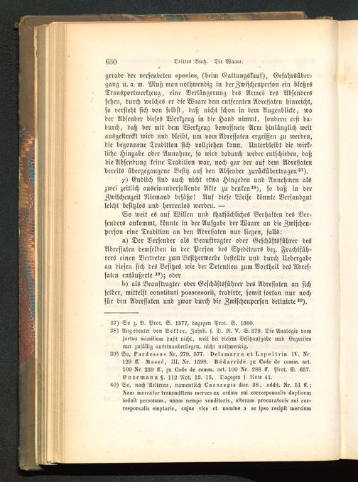 gerade der versendeten spsoiss, (beim Gattungskauf), Gefahrsüber-gang u.a.m. Muß man nothwendig in derZwischenperson ein bloßesTransportwerkzeug, eine Verlängeruug des Armes des Absenderssehe», durch welches er die Waare dem entfernten Adressaten hinreicht,so versteht sich von selbst, daß nicht schon in dem Augenblicke, woder Absender dieses Werkzeug in die Hand nimmt, sondern erst da-durch, daß der mit dem Werkzeug bewaffnete Arm hinlänglich weitausgestreckt wird und bleibt, um vom Adressaten ergriffen zu werden,die begonnene Tradition sich vollziehen kann. Unterbleibt die wirk-liche Hingabe oder Annahme, so wird dadurch weder entschieden, daßdie Abscndung keine Tradition war, noch gar der auf dem Adressatenbereits übergegangene Besitz aus den Absender zurückübertragen ^).