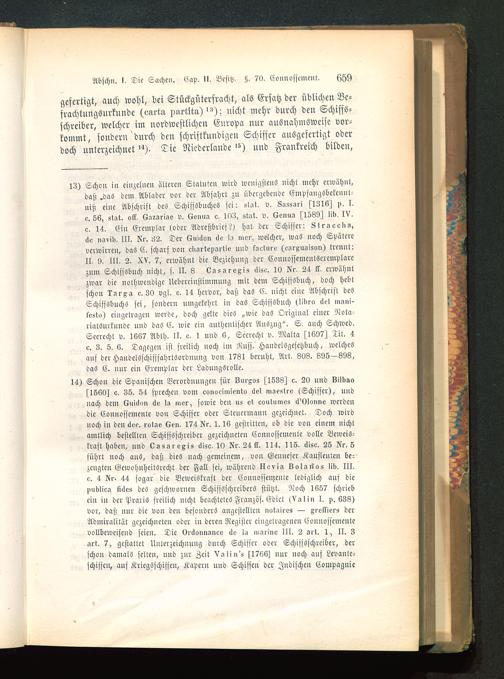13) Schon in einzelnen älteren Slatittc» wird wenigstens nichl mehr erwähnt,daß.das dem Ablader vor der Abfahrt zn übergebende Empfangöbetennl-niß eine Abschrift des SchifsSbucheö sei: --l-tt, v. fI3I6^ ,,, I.e. SS, slnt. off. (Z-ixgrwe v. tZoi»i-r o. IM, »tat. v. lZonua ^1539^ lib. IV.c. 14. Ein Cremplar (oder Adreßbrief?! hat der Schiffer: Straoo!,-,,<>u »Avlb. lll. Kr. 32. Der lZiiulon <Io lu mcr, welcher, waö noch Spätcrcverwirren, das C. scharf von c>>arlenartie nnd küelurv (csrxuaison) trennt!II. 9. III. 2. XV. 7, erwähnt die Beziehung der Connossemcntscreuiplarcznm Schifföbnch nicht, s. II. 8 eas.iroxiü uisc. 10 Kr. 24 17. erwähntzwar die nothwendige Ucbercinstinimnng mit dem Schifföbnch, doch hebtschon r-ri-xs c. 30 vgl. c. 14 hervor, daß daS C. nicht eine Abschrift dc«Schifssbnchö sei, sondern umgekehrt in das Schifföbnch (Miro a» m-ini-f»!it>,) eingetragen werde, doch gelte dies „wie das Original einer Nota-riatöurkunde und daS C. wie ei» authentischer Auszug". S. auch Schweiz .Secrecht v. 1667 Abth. II. c. I nnd 6, Sccrecht v. Malta fIK97^ Tit . 4e. 3. 5. 6. Dagegen ist freilich noch im Rufs. Handelsgesetzbuch, welchesauf der Handelsschisffahrtsordnnng von 1731 beruht, Art. 803. 896—398,das C. mir ein Cremplar der Ladungsrolle.