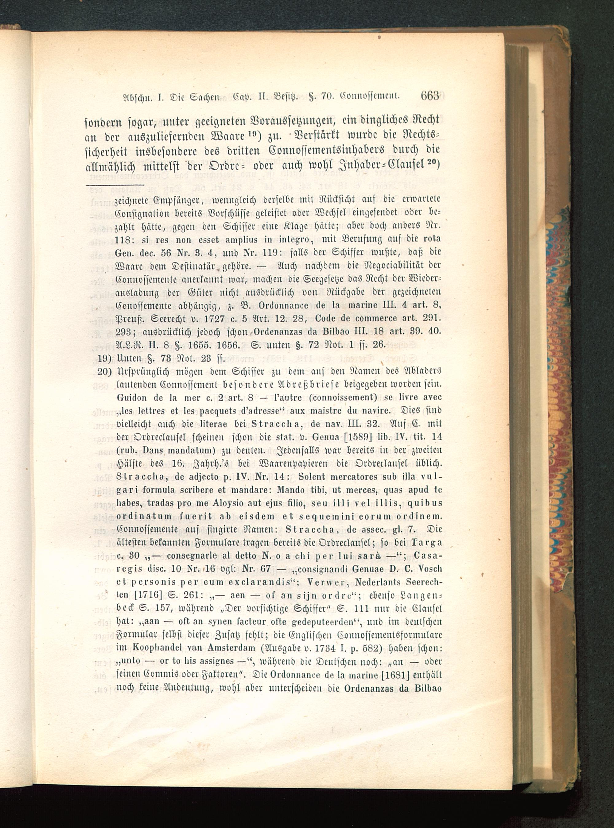 sondern sogar, unter geeigneten Voraussetzungen, ein dingliches Rechtan der auszuliefernden Waare'») zu. Verstärkt wurde die Rechts-sicherheit insbesondere des dritten ConnossementSinhabcrs durch dicallmählich mittelst der Ordre- oder auch wohl Inhaber-Clausel2°)