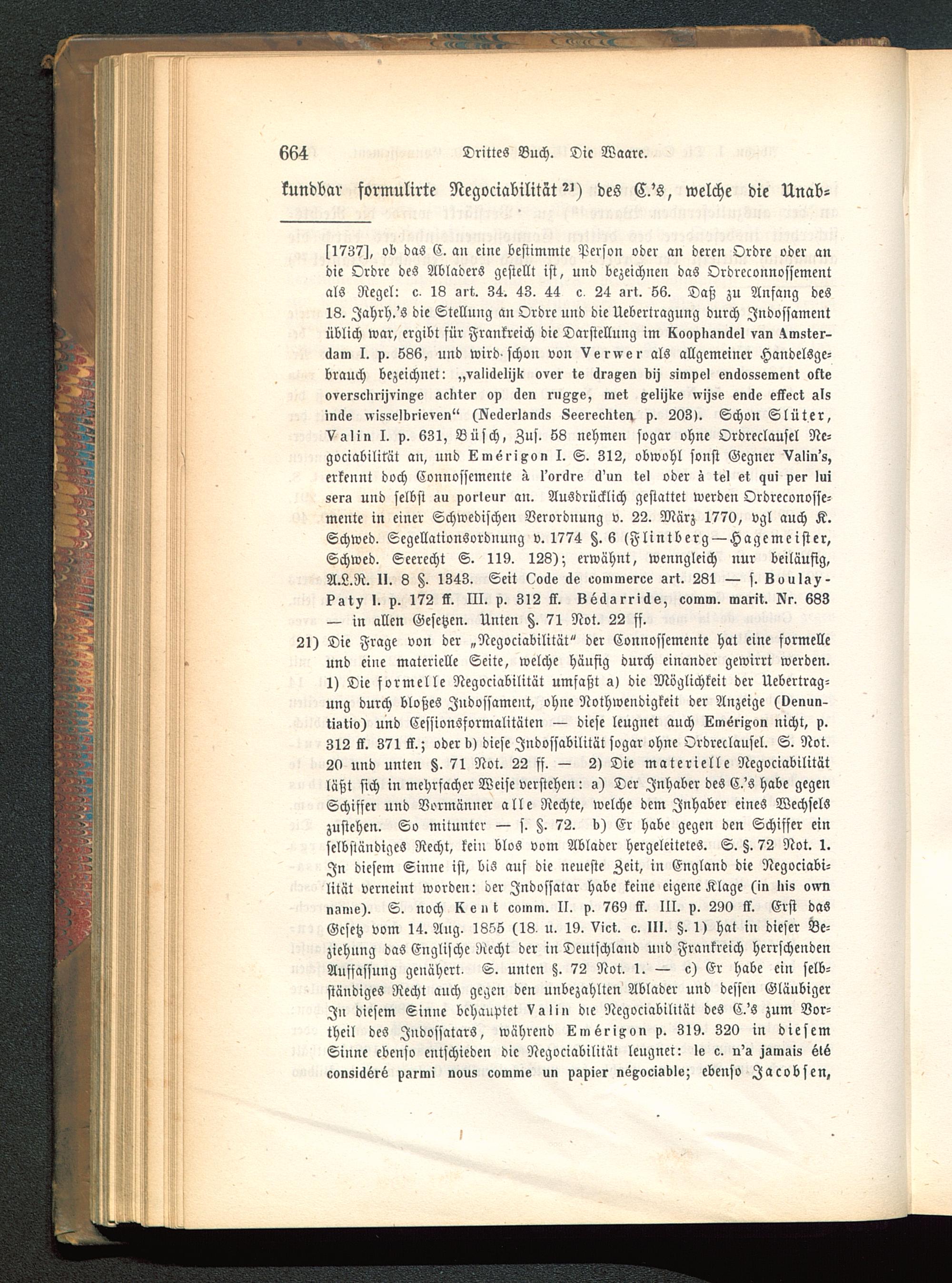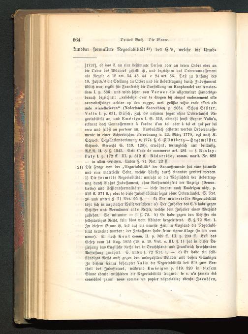 s1737), ob das C. an eine bestimmte Person oder an deren Ordre oder andie Ordre des Abladers gestellt ist, und bezeichnen das Ordreconnossementals Regel: c- 18 srt. 34. 43. 44 c 24 3rt. 66. Daß zu Anfang des18. Jahrh.'s die Stellung an Ordre und die Uebertragung durch Indossamentüblich war, ergibt für Frankreich die Darstellung im kooplisnilel vsn 4mster-dsm I. p. 586, und wird-schon von Vervver als allgemeiner Handelsge-brauch bezeichnet: „vglickelijk over te clrsxen bij simpel enclossement okteoversclirisvinxe scliter op clen riiAxe, met xeliMe «ijse en<ie elkeot alsincke ,visselbrieven" (Reilerlgncls Seereckten, p. 203). Schon Slüter,Vslin I. p. 631, Busch, Zus . 58 nehmen sogar ohne Ordreclausel Ne-gociabilitüt au, und Lmei-ixon I. S. 312, obwohl sonst Gegner Vslin's,erkennt doch Connossemente -t I'oröre 6'un tel oder s tel et qui per luisers und selbst su porleur an. Ausdrücklich gestattet werden Ordreconosse-mente in einer Schwedischen Verordnung v. 22. März 1770, vgl auch K.Schwed. Segellationsordnung v. 1774 §.6 <Flintberg —Hagcmeister,Schweb. Seerecht S. 119. 128); erwähnt, wenngleich nur beiläufig,A.L.R. II. 8 §. 1343. Seit Ode Se evmmerce srt. 281 — s. Souls?-kst? I. p. 172 kk. III. p. 312 kk. Seäsrriäs, vomm. msrit. Nr, 683— in allen Gesetzen. Unten §. 71 Not. 22 ff.21) Die Frage von der „Negociabilität" der Connossemente hat eine formelleund eine materielle Seite, welche häufig durch einander gewirrt werden.1) Die formelle Negociabilität umfaßt s) die Möglichkeil der Uebertrag-ung durch bloßes Indossament, ohne Nothwendigkeit der Anzeige (venun-tistio) und Cessionsformalitäten — diese leugnet auch Lmvrixon nicht, p.312 kk. 371 kk.; oder b> diese Jndossabililät sogar ohne Ordreclausel. S. Not.20 und unten tz. 71 Not. 22 ff. — 2) Die materielle Negociabilitätläßt sich in mehrfacher Weise verstehen: s) Der Inhaber des C.'s habe gegenSchisser und Vormänner alle Rechte, welche dem Inhaber eines Wechselszustehen. So mitunter — s. §. 72. b) Er habe gegen den Schiffer einselbständiges Recht, kein blos vom Ablader hergeleitetes. S. §. 72 Not. 1.In diesem Sinne ist, bis auf die neueste Zeit, in England die Negociabi-lität verneint worden: der Jndossatar habe keine eigene Klage (in liis ominsnie). S. noch Ke » l comm. II. p. 769 kk. III. p. 290 kk. Erst dasGesetz vom 14. Ang, 1855 (18, u. 19. Vict. c. III. §. 1) hat in dieser Be-ziehung das Englische Recht der in Deutschland und Frankreich herrschendenAuffassung genähert. S. unten §. 72 Not. 1. — e) Er habe ein selb-ständiges Recht auch gegen den unbezahlten Ablader und dessen GläubigerIn diesem Sinne behauptet Vslin die Negociabilität des C.'s zum Vor-theil des Jndossatars, während kmsrixon p. 319. 320 in diesemSinne ebenso entschieden die Negociabilität leugnen le c. ri's ssmsis sl6oonsiaere psrmi »aus eomme un pspier nexocisble; ebenso Jacobsen,