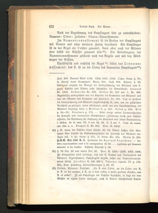 21) §. 70 Not. 20 und unten Not. 25. Prot. S. 2203-2208. 4005. 4006.In Kriegözeitcn wird verlangt, daß das C. Namen und Nationalität desAbladers, Eigeuthümcrs, Empfängers angebe, daher nur Namensconnosse-mente üblich. Jacobsen S. 126. 266 ff. Vinoens, exposit. III. p. 154.Rev. Plan Hamburg . Seeversicherungen §. 65. 67.