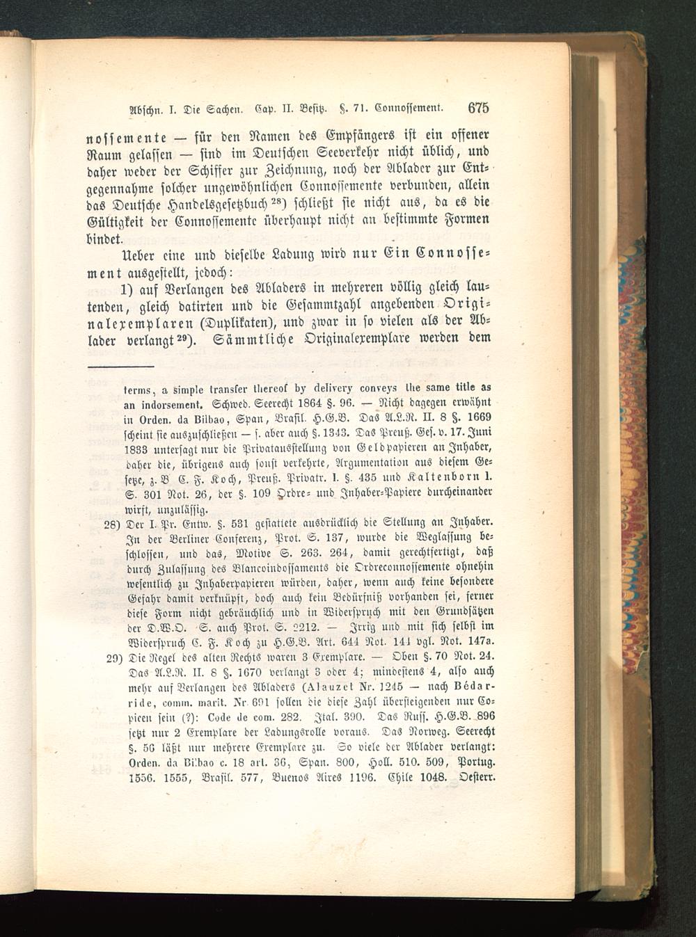 29) Die Regel des alten Rechts wareu 3 Eremplare. — Oben §. 70 Not. 24.Das A.L.N. II. 6 Z. 1670 verlangt 3 oder 4; mindestens 4, also auchmehr auf Verlangen des Abladers (^Isuact Nr. 1245 — nach vöilar-riile, »vmi». msrlt. Nr 691 sollen die diese Zahl übersteigenden nur Co-picen sein (?): c»de de com. 232. Jtal. 390. Das Rnss. H.G.B. 896setzt nnr 2 Eremplare der Ladungsrolle voraus. Das Norweg. Seerecht§. 56 läßt unr mehrere Eremplare zu. So viele der Ablader verlangt:Oräon. ua vi'.daa c. 18 -ul. 36, Span . 800, Holl. 510. S09, Portug.1556. 1555, Brasil. 577, Buenos Aires 1196. Chile 104S. Oesterr.