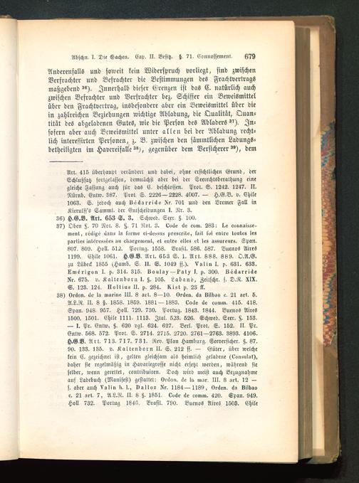 38) vrckvn. cke Is msrine III. 3 srt. 8—10. Orden. cks Lilbso c. 21 srt. 5.A.L.R. II. 8 §. 1353. 1359. 1331— 1883. Locke cke comin. 415. 418.Span. 948. 957. Holl. 729. 730. Portug. 1343. 1844. Buenos Aires 1500. 1501. Chile 1111. 1113. Jtal. 523. 526. Schwed . Seer. 153.— I. Pr. Entw. ß. 620 vgl. 624. 627. Berl. Prot. S. 152. II. Pr.Entw. 568. 572. Prot. S. 2714. 2715. 2720. 2761—2763. 3893. 4106.H.GB. Art. 713. 717. 731. Rev. Plan Hamburg . Seeversicher. §.37.90. 133. 135. v. Kaltenborn II. S. 212 ff. — Güter, über welchekein C. gezeichnet ist, gelten gleichsam als heimlich geladene (LonsulAl),daher sie regelmäßig in Havariegrosse nicht ersetzt werden, während sieselber, wenn gerettet, contribuireu. Doch wird meist auch Bezuguahmeauf Ladebuch (Manifest) gestattet: Orckon. cke I» m.ir. III. 8 srt. 12 —s. aber auch Valin I>. I., vsllo? Hr. 1134—1139, Orcken. ck« Kilos»c. 21 -,,-t, 7, A L.N. II. 8 §. 1851. Locke cke comm. 420. Span. 949.Holl 732. Portug 1L4l>. Brasil. 790. Buenos Aires 15VS. Chile