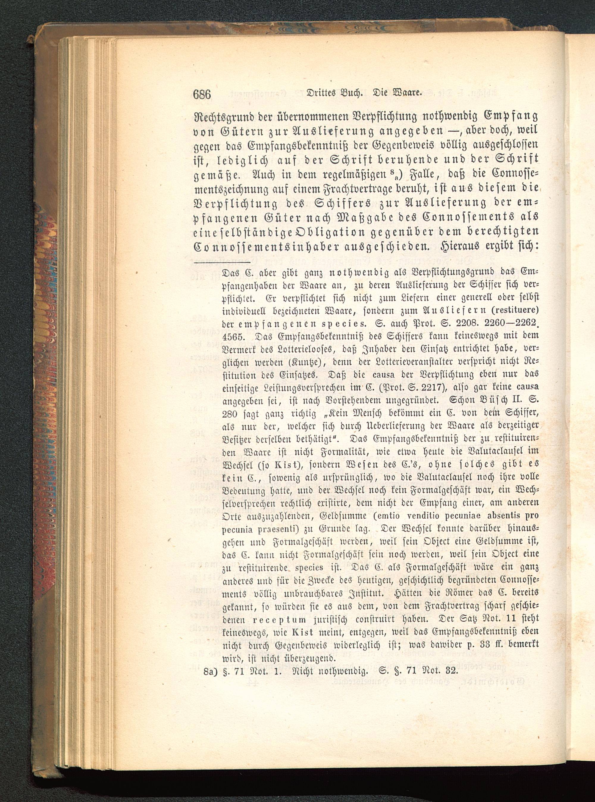 Das C> aber gibt ganz nothwendig als Verpflichtungsgrund das Em-pfangcnhabcn der Waare an, zu deren Auslieferung der Schiffer sich ver-pflichtet. Er verpflichtet sich nicht zum Liefern einer generell oder selbstindividuell bezeichneten Waare, sondern zum Ausliefern (restituere)der emp sau g ene n sp eei es. S. auch Prot. S. 2203. 2260—2262.4566. Das Empfangsbekenntniß des Schiffers kann keineswegs mit demVermerk des Lottericlooses, daß Inhaber den Einsatz entrichtet habe, ver-glichen werden (Kuntze), denn der Lottcrieveraustalter verspricht nicht Re-stitution des Einsatzes. Daß die esuss der Verpflichtung eben uur daseinseitige Leistuugsversprecheu im C. (Prot. S. 2217), also gar keine causaangegeben sei, ist nach Vorstehendem ungegründet. Schon Busch II. S.280 sagt ganz richtig „Kein Mensch bekommt ein C. von dem Schiffer,als nur der, welcher sich durch Ueberlieferung der Waare als derzeitigerBesitzer derselben bethätigt". Das Einpfaugsbekeuntuiß der zu restituiren-den Waare ist nicht Formalität, wie etwa heute die Balutaclausel imWechsel (so kisk), sondern Wesen des C.'s, ohne solches gibt eSkeiu C., sowenig als ursprünglich, wo die Balutaclausel »och ihre volleBedeutung hatte, uud der Wechsel noch kein Formalgeschäft war, ein Wech-selversprechen rechtlich eristirte, dem nicht der Empfang einer, am anderenOrte auszuzahlenden, Geldsumme (emtio venä'iUo pecunigs gbsentis propecuiiia praesenti) zu Gruude lag. Der Wechsel konnte darüber hinaus-gehen und Formalgcschäft werden, weil sein Object eine Geldsumme ist,daö C. kaun nicht Formalgeschäft sein noch werden, weil sein Object einezn rcstituirendc species ist. Daö C. als Formalgcschäft wäre ein ganzanderes nnd für die Zwecke des hentigen, geschichtlich begründeten Connosse-mcntS völlig unbrauchbares Institut. Hätten die Römer das C. bereitsgekannt, so würden sie es aus dem, von dem Frachtvertrag scharf geschie-denen receptum juristisch constrnirt haben. Der Satz Not. 11 stehtkeineswegs, wie Kist meint, entgegen, weil das EmvfangSbekenutniß ebennicht durch Gegenbeweis widcrleglich ist; waö dawider p. 33 kk. bemerktwird, ist nicht überzeugend.8s) z, 71 Not. 1. Nicht nothwendig. S. §. 71 Not. 32.