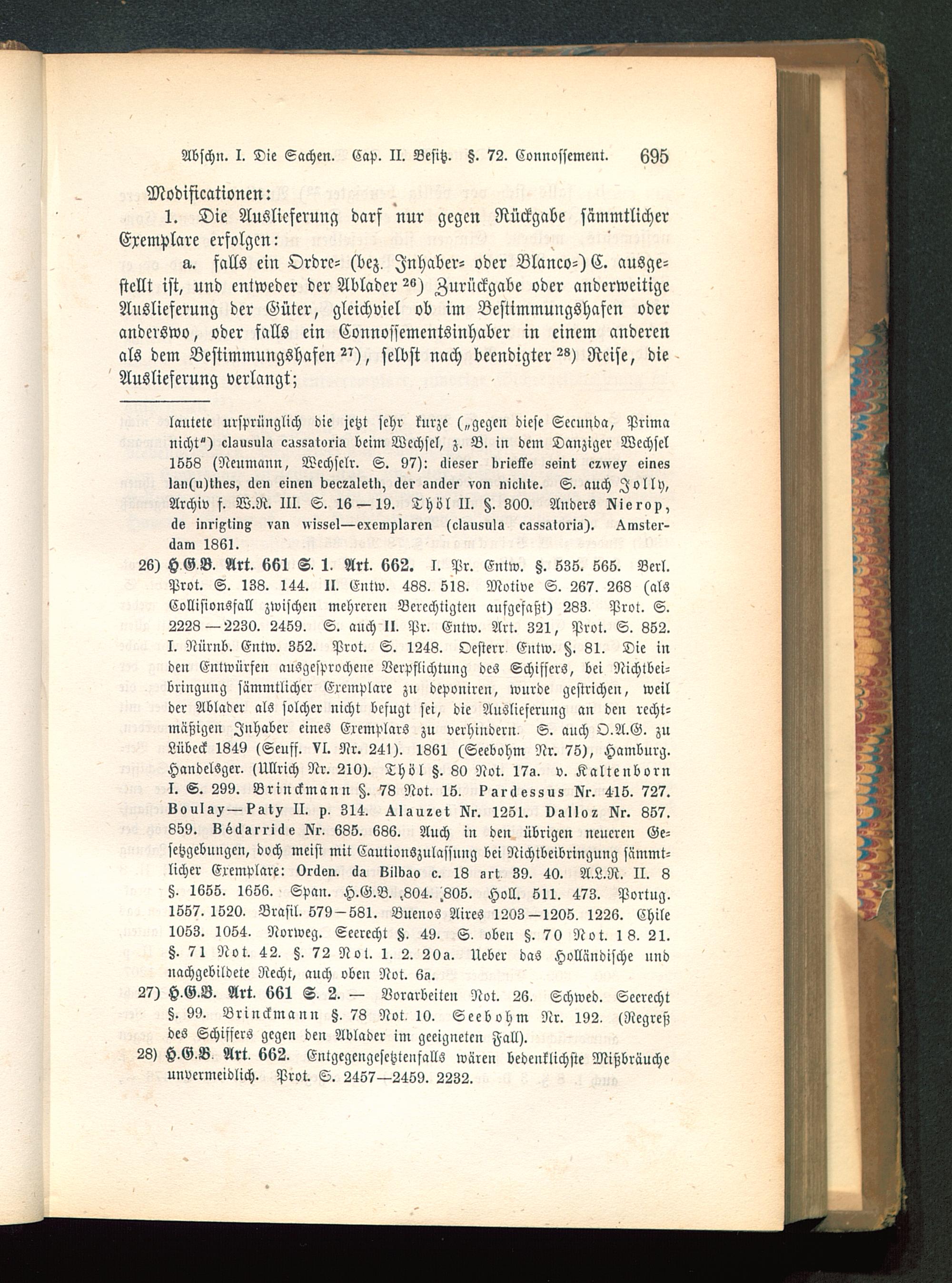 26) H G B. Art. K61 S. 1. Art. 662. I. Pr. Entw. §. 638. 665. Berl.Prot. S. 138. 144. II. Entw. 488. 516. Motive S. 267. 263 (alsCollisionsfall zwischen mehreren Berechtigten aufgefaßt) 283. Prot. S.2223 —2230. 2459. S. auch II. Pr. Entw. Art. 321, Prot. S. 652.I. Nürnb. Entw. 352. Prot. S. 1243. Oesterr Entw. §. 81. Die inden Entwürfen ausgesprochene Verpflichtung des Schiffers, bei Nichlbei-bringung sämmtlicher Exemplare zn deponircn, wnrde gestrichen, weilder Ablader als solcher nicht befugt sei, die Auslieferung an den recht-mähigen Inhaber eines Eremplars zu verhindern- S. auch O.A.G. zuLübeck 1349 (Seuff. Vl. Nr. 241). 1861 (Seebohm Nr. 75), Hamburg .HandelSger. (Ullrich Nr. 210). Thöl §. 80 Not. 17s. v. KaltenbornI. S. 299. Brinckmann §. 78 Not. 16. ?sräessus Nr. 416. 727.Louis?—?stv II. p, 314. ^Isu-et Kr. 1261. vsllor Kr. 667.859. köcksrriae Kr. 635. 636. Auch in den übrigen neueren Ge-setzgebungen, doch meist mit CautionSzulassung bei Nichtbeibringung sämmt-licher Eremplare: Oräen. <is kilbso c. 13 srt, 39. 40. A.L.R. II. 8§. 1655. 1666. Span. H.G.B. .804. .806. Holt. 511. 473. Portug.1657.1520. Brasil. 579-531. Buenos Aires 1203-1206.1226. Chile1053. 1064. Norweg. Seerecht Z. 49. S, oben §. 70 Not. 13. 21.Z. 71 Not. 42. §. 72 Not. 1. 2. 20s. Neber das Holländische nndnachgebildete Recht, auch oben Not. 6s.