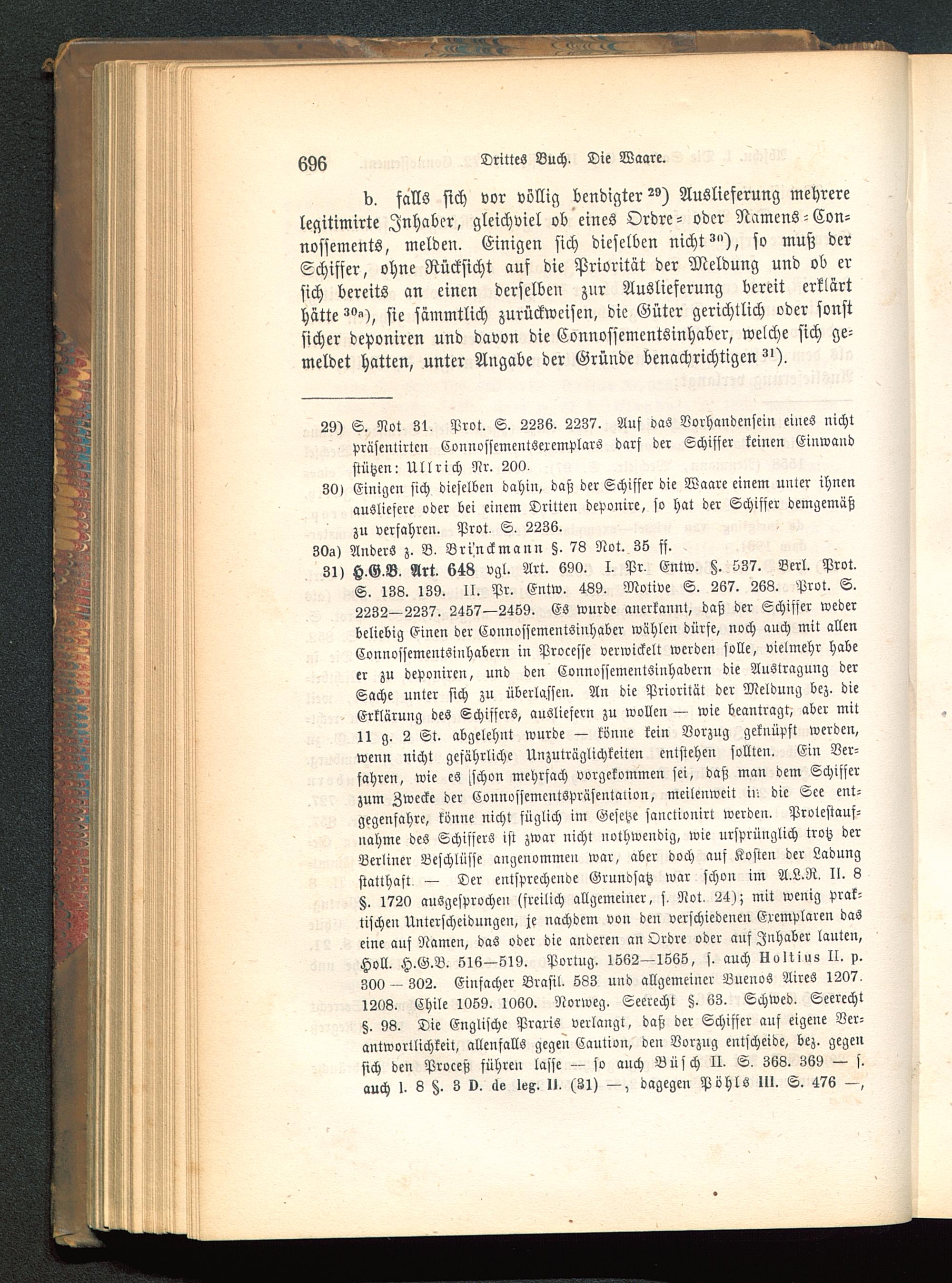 31) H.G.B. Art. 648 vgl. Art. 630. 1. Pr, Entw. §. 537. Berl. Prot.S. 188. 139. II. Pr. Entw. 489. Motive S. 267. 263. Prot. S.2232—2237. 2457—2459. Es wurde anerkannt, daß der Schifser wederbeliebig Einen der Connossementsinhaber wählen dürse, noch auch mit allenConnossementsinhabern in Processe verwickelt werden solle, vielmehr habeer zu deponiren, und den Connossementsinhabern die Austragung derSache unter sich zu überlassen. An die Priorität der Meldung bez. dieErklärung des Schiffers, ausliefern zu wollen — wie beantragt, aber mitII g. 2 St. abgelehnt wurde — könne kein Vorzug geknüpft werden,wenn nicht gefährliche Unzuträglichkeiten entstehen sollten. Ein Ver-fahren, wie es >schon mehrfach vorgekommen sei, daß man dem Schifferzum Zwecke der Counossemcntspräsentaüon, meilenweit in die See ent-gegenfahre, könne nicht füglich im Gesetze sanclionirt werden. Prolestauf-nahme des Schiffers ist zwar nicht nothwendig, wie ursprünglich trotz derBerliner Beschlüsse angenommen war, aber doch auf Kosten der Ladungstatthaft, — Der entsprechende Grundsatz war schon im A.L.R, II. 3K. 1720 ausgesprochen (freilich allgemeiner, s, Not, 24); mit wenig Prak-tischen Unterscheidungen, je nachdem von den verschiedenen Eremplaren daseine aus Namen, das oder die anderen an Ordre oder auf Inhaber lauten,Holl. H.G.B. 516—519. Portug. 1562—1565, s. auch llultius II. p.300 - 302. Einfacher Brasil. 583 und allgemeiner Buenos Aires 1207,1208. Chile 1059. 1060. Norweg. Seerecht §. 63. Schwed , Seerechl§. 98. Die Englische Praris verlangt, daß der Schifser auf eigene Ver-antwortlichkeit, allenfalls gegen Caution, den Vorzug entscheide, bez. gegensich den Proceß sühren lasse — so auch Büsch II. S, 363. 369 — s.auch I. 8 8- 3 0. äe lox. II. (31) dagegen Pöhls III. S. 476 -,