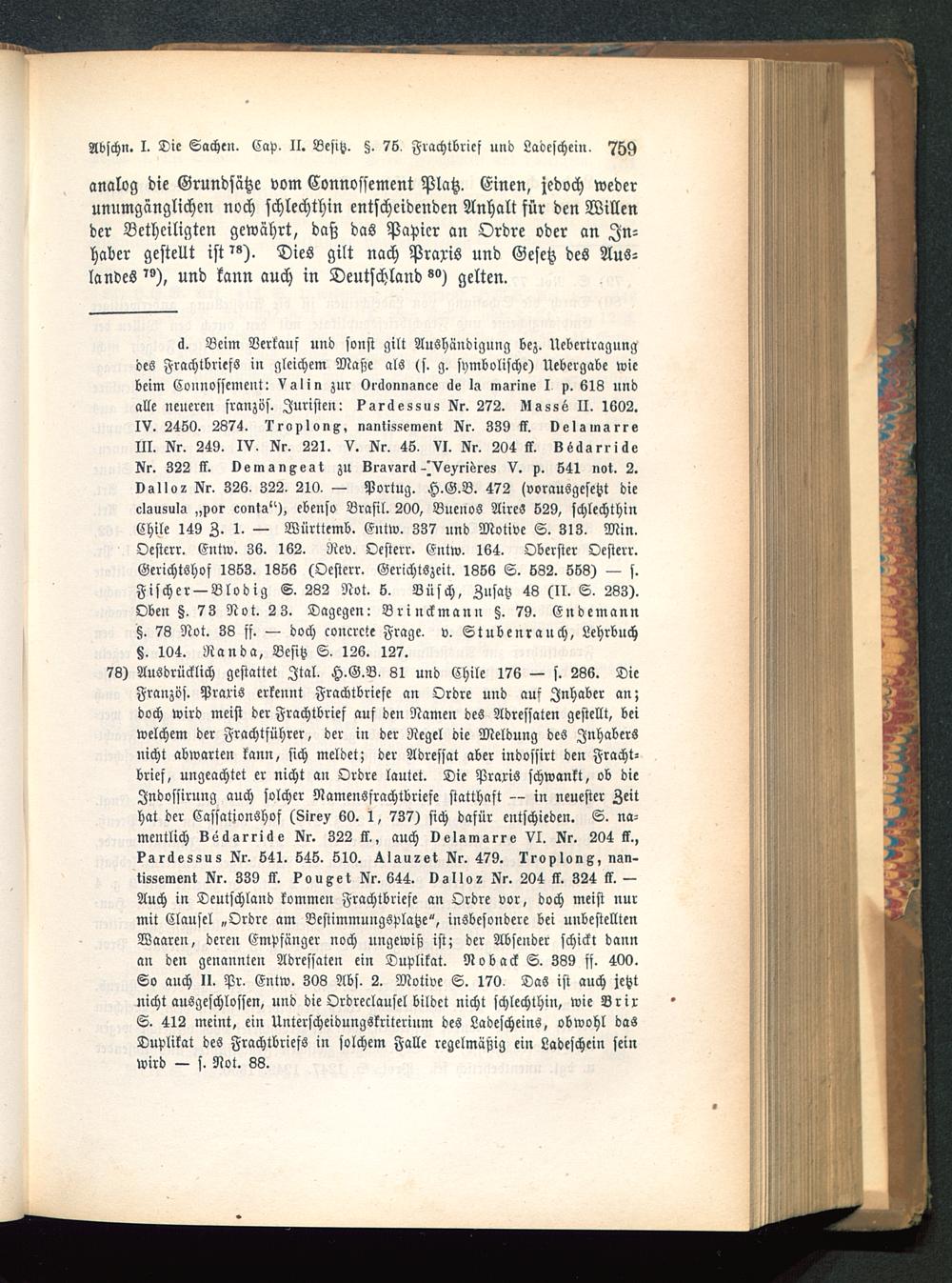 cl. Beim Verkauf und sonst gilt Aushändigung bez. Nebertragungdes Frachtbriefs in gleichem Maße als (s. g. symbolische) Uebcrgabe wiebeim Connossement: Vslin znr vi^onnsnce <Ie I» msrine I p. 618 undalle neueren französ. Juristen: ksrckessus Hr. 272. SI»8ss II. 1L02.IV. 2460. 2874. Iroplonx, nantissement Nr. 339 ff. velamsrreIII. Nr. 249. IV. Nr. 221. V. Nr. 46. VI. Nr. 204 ff. SödsrriSeNr. 322 ff. vemsnxegt zu Sravsrck-^Vs^ri^re8 V. p. 841 not. 2.Vsllo2 Nr. 326. 322. 210. — Portug. H.G.B. 472 lvorausgesetzt dieclsusula „por conts")^ ebenso Brasil. 200, Buenos Aires 529, schlechthinChile 149 Z. 1. — Wnrttemb. Entw. 337 und Motive S. 313. Min.Oesterr. Entw. 36. 162. Rev. Ocsterr. Entw. 164. Oberster Oesterr.Gerichtshof 1863. 1866 (Oesterr. Gerichtszeit. 1866 S. 682. 663) — s.Fischer —Blodig S. 282 Not. 6. Busch, Zusatz 43 (II. S. 283).Oben §. 73 Not. 23. Dagegen: Brinckmann §. 79. Eudemann§. 78 Not. 38 ff. — doch concrcte Frage, v. Stubenrauch, Lehrbuch§. 104. Ran da, Besitz S. 126. 127.78) Ausdrücklich gestattet Jtal. H.G.B. 81 und Chile 176 — s. 266. DieFranzbs. Praris erkennt Frachtbriefe an Ordre und am Inhaber an;doch wird meist der Frachtbrief auf den Namen des Adressaten gestellt, beiwelchem der Frachtführer, der in der Regel die Meldung des Inhabersnicht abwarten kann, sich meldet; der Adressat aber indossirt den Fracht-brief, ungeachtet er nicht au Ordre lautet. Die Praxis schwankt, ob dieJndossirung auch solcher Namensfrachtbriefe statthaft — in neuester Zeithat der Cassationshof (8ir«x 60. 1, 737) sich dafür entschieden. S. na-mentlich vecksrriäs Nr. 322 ff., auch velsmsrre VI. Nr. 204 ff.,ksrckessus Nr. 641. 646. 610. ^lau^et Nr. 479. Iroplong, nsn-tissement Nr. 339 ff. ?ouxet Nr. 644. vgllo? Nr. 204 ff. 324 ff. —Auch in Deutschland kommen Frachtbriefe an Ordre vor, doch meist nurmit Clausel „Ordre am Bestimmungsplatze", insbesondere bei unbestelltenWaaren, deren Empfänger noch ungewiß ist; der Absender schickt dannan den genannten Adressaten ein Duplikat. Noback S. 339 fs. 400.So auch II. Pr. Entw. 303 Abs. 2. Motive S. 170. Das ist auch jetztnicht ausgeschlossen, und die Ordreclausel bildet nicht schlechthin, wie BrirS. 412 meint, ein Unterscheidungskriterium des Ladescheins, obwohl dasDuplikat des Frachtbriefs in solchem Falle regelmäßig ein Ladeschein seinwird — s. Not. 83.
