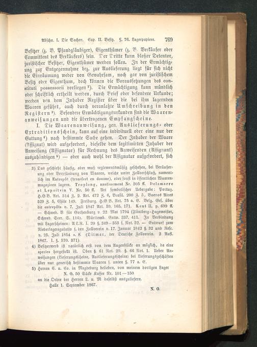 3) Das geschieht häufig, oder muß rcglemeutsmaßig geschehen, bei Veräußer-ung oder Verpfändung von Waaren, welche unier Zollverschluß, nament-lich im 15»>re>,öt (trsn^ert en öouane), oder sonst in öffentlichen Waaren-magazinen lagern. Iioplvnx, risnIissemeiN Nr. 3«S ff. Delam-irreet I.spoitvin V. Nr. 50 ff. Art symbolischer Uebcrgabe: Portug .H.G B. Art. 314 Z. 2. Art. 472 Z. 6, Brasil. 200 Z. L, Buenos Aires S2g Z, 6, Chile 149. Frciburg. H.G B. Art. 75 a. E. Bclg. Ges. überdie ei>lrer,6ts v. 7. Znli 1847 Art. 59. 165. 171. livnt II. p. 699 ff.— Schweb. V für Gotheuburg v, 22, Mai 1794 Mnlberg-Hagemeisier,Schwed . Sccr. S. 116). Wnritcmb. Entw. 337. 411. In Verbindungmit Lagerscheinen: A L.N. I. 20 §.349-353 s. Not. 32. — Entwurf zumNicderlagcregulativ f. den Zollverein v. 17. Januar 1842 §. 32 und Nesc.v. 25. Juli 1854 «. 8! (Ditmar, der Deutsche Zollverein . 2 Aufl.1867. I. §. 370. 371),