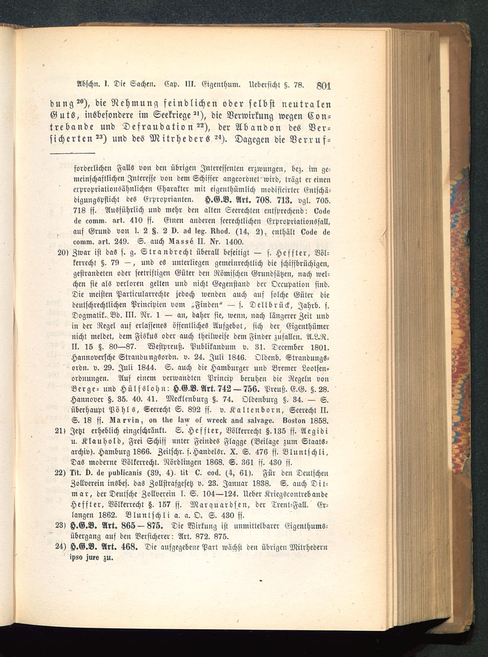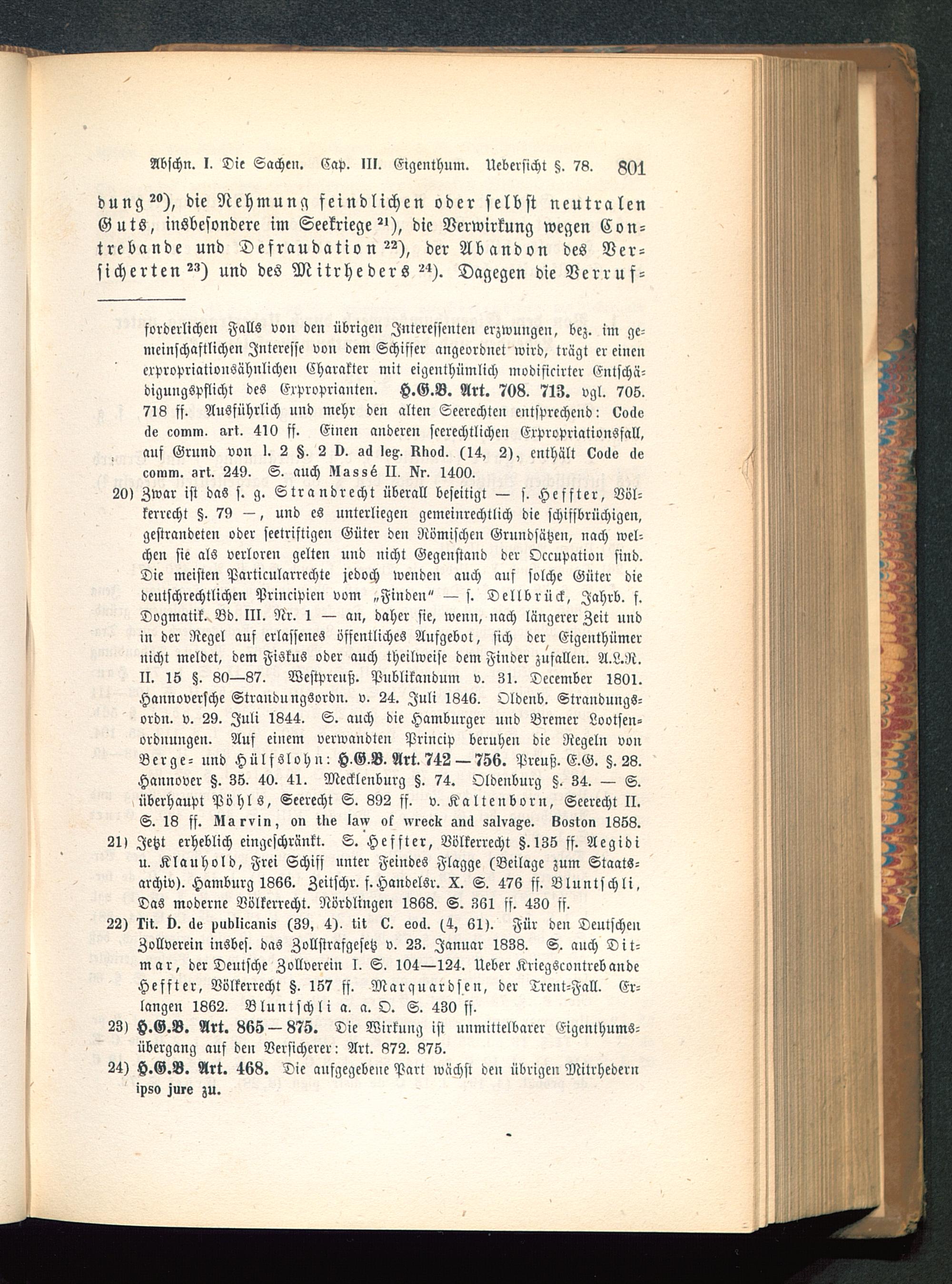 21> Jetzt erheblich eingeschränkt. S. Heffter, Völkerrecht §.135 ff. Aegidiu. Klauhold, Frei Schiff unter Feindes Flagge (Beilage zum Staats-archiv). Hamburg 1866. Zeitschr. f.Handelsr. X. S. 476 ff. Bluntschli,Das moderne Völkerrecht. Nördlingen 1368. S. 361 sf. 430 ff.