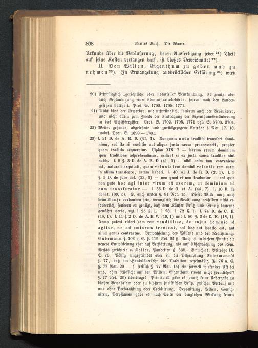 23) I. 31 v. <Ie k. v. (41. 1). Nunqu-ira nuckkr trgckitio trsnskert ckomi-nimn, 8eck its 8> venckitio sut aliizua j»8ta csu8S prsecesserii, propler>I»!>m trsclitio 8ecj»eretur. Illpisn XIX. 7 — >>sr»m rerum ckominiiimipsa Irsckitione sciprelienciimu», scilicet si ex ^usts esuss trsckitse »intnodis. I. 9 §, 3 l). cke ^. k, v, (41, I) — ninil enim tsm eonveniensost, nslllrsli se^uitsti, qusm voluntgtem ckomini volenti» rem susmin slium transkerre, rstsm Iisberi, Z. 40. 41 ,7, äe k v. (2, 1). I, 9§, 3 v. ckv jure ckot. (23, 3) — non quock ei non trgckuntur — se6 <zui»non puto Iioc sxi inter virum et uxorvm, ut ckominiiim säeum trsnskerstur —. I, 55 0, cke 0, et ^. (44, 7), I. 10 0. ckeckonst, (39, 5), S. auch unten K. 81 Not. 15. Dieser Wille muß auchbeim Kaufe vorhanden sein, wenngleich die Nealisiruug desselben nicht er-forderlich, sondern es genügt, daß dem Käufer Besitz und Genuß dauerndgewährt werde, vgl. I, 25 §. 1. I. 28. I. 72 §. I. I. 74 0. cke v. L.(18, 1). I. 11 z, 2 v. cke L. V. (19, 1) mit I. 30 §. 3 cke v. L. (18, 1).Aemo potegt vickeii esm rem venckicki8se, c>e euju8 ckominio ickiixitur, ne sck emtorem trsn8sst, 8«ck Iioc aut locstio e8t> sutsliuck xenus co»trsetu8. Verwechselung des Willens und der Realisirung!Endemann §. 103 g. E. K. 112 Not, 21 ff. Auch ist in diesem Punkte dieneuere Entwickelung eher auf Verstärkung, als auf Abschwächung des Rom .Rechts gerichtet: v. Keller, Pandekten §, 330. Gruchot, Beiträge IX.S. 73. Völlig uugegrüudet aber ist die Behauptung Endemann'stz. 77, daß im Handelsverkehr die Tradition regelmäßig (K. 76 a. E.§. 77 Not. 20 — s, freilich § 77 Not. 15) ein formell wirkender Akt seiund, ohne Rücksicht aus deu Willen, Eigenthum (wohl nicht förmliches?§. 77 Not. 20) übertrage! Principiell gäbe es sonach keine Uebergabe zubloßer Gewahrsam oder zu bloßem juristischen Besitz, zwischen Verkauf mituud ohne Preiszahlung oder Creditirung, Depouiruug, Leihe», Consig-niren, Verpfänden gäbe es nach Seite der dinglichen Wirkung keinen