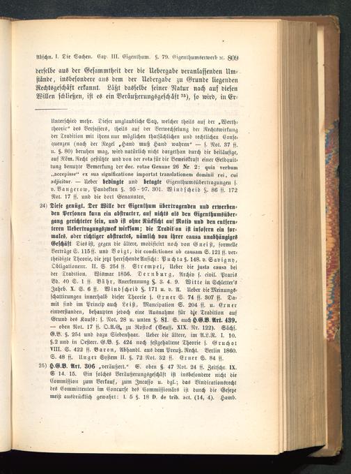 24) Diese genügt. Der Wille der Eigenthum übertragenden und erwerben-den Personen kann ein abstrakte r, aus nichts als den Eigenthumsüber-gang gerichteter sein, und ist ohne Rücksicht auf Motiv und den entfern-teren Uebertragungszweck wirksam; die Tradit on ist insofern ein for-males, oder richtiger abstraktes, nämlich von ihrer v»ii8a unabhängigesGeschäft Dies ist, gegen die ältere, modificirt noch von G nei st, formelleVerträge S. 116 ff. und Voigt, die eoiillictionvs ob csussm S. 121 ff. ver-theidigte Theorie, die jetzt herrschende Ansicht: Puchta §. 143. v, Savigny ,Obligalionenr. II. S 284 ss. Stremvel, Ueber die justs csusa beider Tradition. Wismar 1866. Dernburg , Archiv f. civil. PrarisBd. 40 S. 1 ff. Bahr, Anerkennung §. 3. 4. 9. Witte in Schletter'SJahrb. X. S. 6 ff. Windscheid §. 171 u. v. A. Ueber dieMeinungs-schatlirungcn innerhalb dieser Theorie s. Erner S. 74 ff. 307 ff. Da-mit sind im Princip auch Leisi, Mancipation S. 204 ff. u. Ernereinverstanden, behaupten jedoch eine Ausnahme für dje Tradition aufGrund des Kaufs: s. Not. 23 u. unten §. 81. S. auch H.G.B. Art. 439.— oben Not. 17 ff. O.A.G. zu Rostock (Scufs. XIX. Nr. 122). Sächs.G.B. §. 284 und dazu Siebenhaar. Ueber die ältere, im A.L.R. I. 10.§.2 und in Oesterr. G.B. §. 424 noch festgehaltene Theorie f. GruchotVIII. S. 422 ff. Baron, Abhandl. aus dem Preuß. Recht. Berlin 1860.S. 48 ff. Unger System II. §. 72 Not. 32 ff. Erner S. 34 ff.