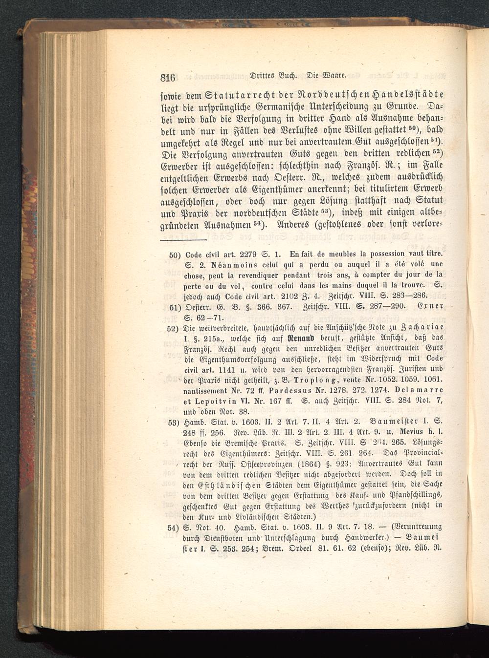 sowie dem Sta tu tarrecht der Norddeutschen Handelsstädteliegt die ursprüngliche Germanische Unterscheidung zu Grunde. Da-bei wird bald die Verfolgung in dritter Hand als Ausnahme behan-delt und nur in Fällen des Verlustes ohne Willen gestattet 5»), baldumgekehrt als Regel und nur bei anvertrautem Gut ausgeschlossen^').Die Verfolgung anvertrauten Guts gegen den dritten redlichen^)Erwerber ist ausgeschlossen: schlechthin nach Französ. R.; im Falleentgeltlichen Erwerbs nach Oesterr. R., welches zudem ausdrücklichsolchen Erwerber als Eigenthümer anerkennt; bei titulirtem Erwerbausgeschlossen, oder doch nur gegen Lösung statthaft nach Statutund Praxis der norddeutschen Städte^), indeß mit einigen altbe-gründeten Ausnahmen 24)- Anderes (gestohlenes oder sonst verlore-