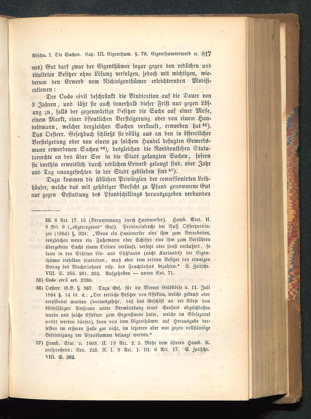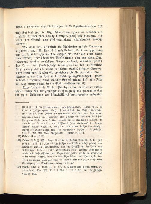 Der Ooäs civil beschränkt die Vindication auf die Dauer von3 Jahren, und läßt sie auch innerhalb dieser Frist nur gegen Lös-ung zu, falls der gegenwärtige Besitzer die Sache auf einer Messe,einem Markt, einer öffentlichen Versteigerung oder von einem Han-delsmann, welcher dergleichen Sachen verkauft, erworben hatDas Oesterr. Gesetzbuch schließt sie völlig aus an den in öffentlicherVersteigerung oder von einem zu solchem Handel befugten Gewerbs-mann erworbenen Sachen^), desgleichen die Norddeutschen Statu-tarrechte an den über See in die Stadt gelangten Sachen, sofernsie dorthin erweislich durch redlichen Erwerb gelangt sind, oder Jahrund Tag unangefochten in der Stadt geblieben sind ^').