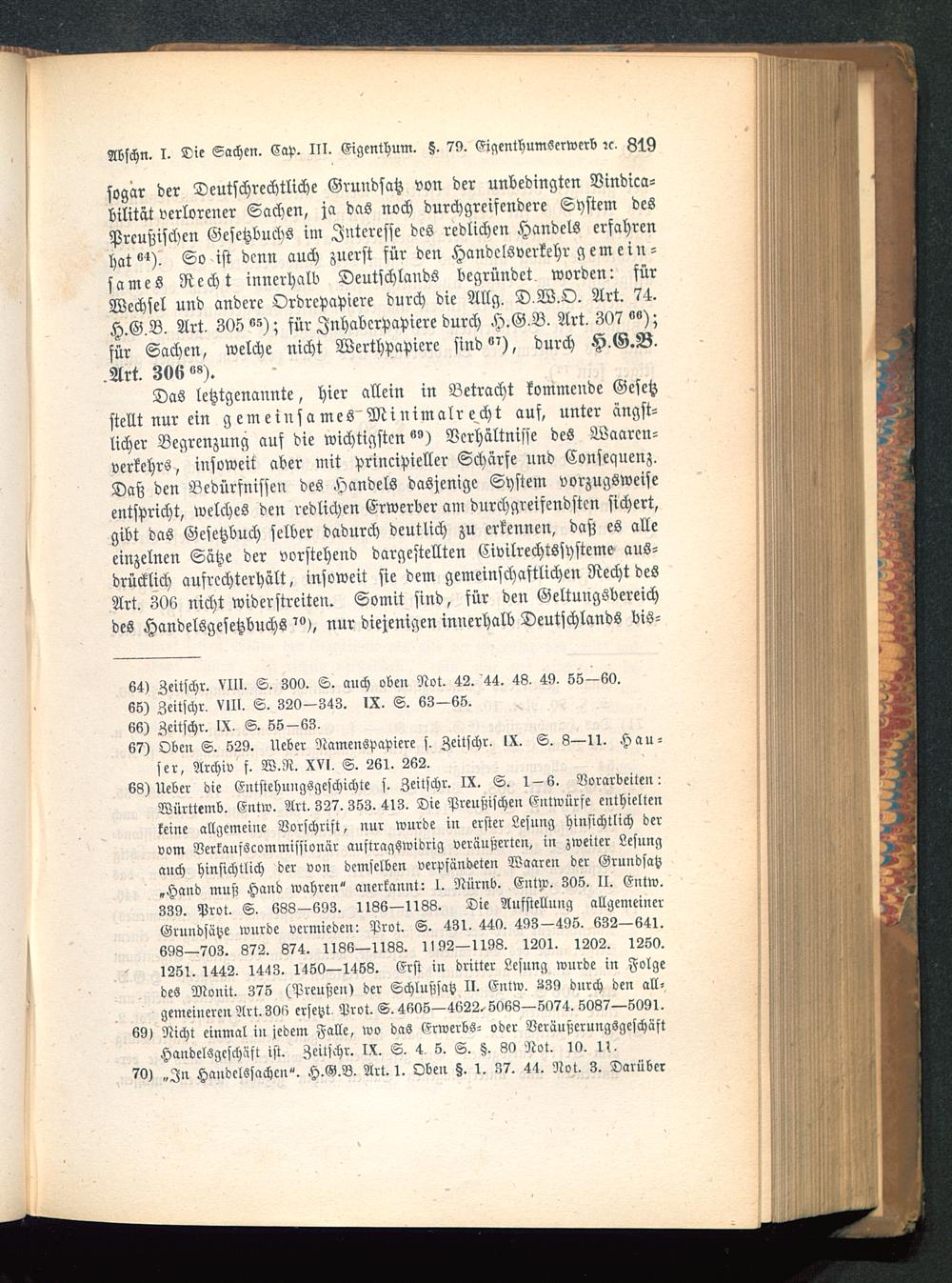 sogar der Deutschrechtliche Grundsatz von der unbedingten Vindica-bilität verlorener Sachen, ja das noch durchgreifendere System desPreußischen Gesetzbuchs im Interesse des redlichen Handels erfahrenhat*"). So ist denn auch zuerst für den Handelsverkehr gemein-sames Recht innerhalb Deutschlands begründet, worden: fürWechsel und andere Ordrepapiere durch die Allg. D.W.O. Art. 74.H.G.B. Art. 305«'); für Jnhabcrpapiere durch H.G.B. Art. 307 ««);für Sachen, welche nicht Werthpapiere sind«'), durch H.G.B..Art. 306«»).