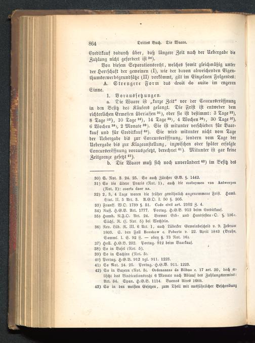 a. Die Waare ist „kurze Zeit" vor der ConcurScröffnungin den Besitz des Käufers gelangt. Die Frist ist entweder demrichterlichen Ermessen überlassen»^), oder sie ist bestimmt: 3 Tage22),8 Tage--), 10 Tage»«), 14 Tage»»), 4 Wochen»"), 30 Tage»'),6 Wochen»6>, 2 Monate»»). Sie ist mitunter verschieden für Baar-kauf und für Kreditkaufs). Sie wird mitunter nicht vom Tageder Ucbergabe bis zur Concurseröfsnung, sondern vom Tage derUebergabe bis zur Klagcanstellung, inzwischen oder später erfolgteConcurseröfsnung vorausgesetzt, berechnet «'). Mitunter ist gar keineZeitgrenze gesetzt^).