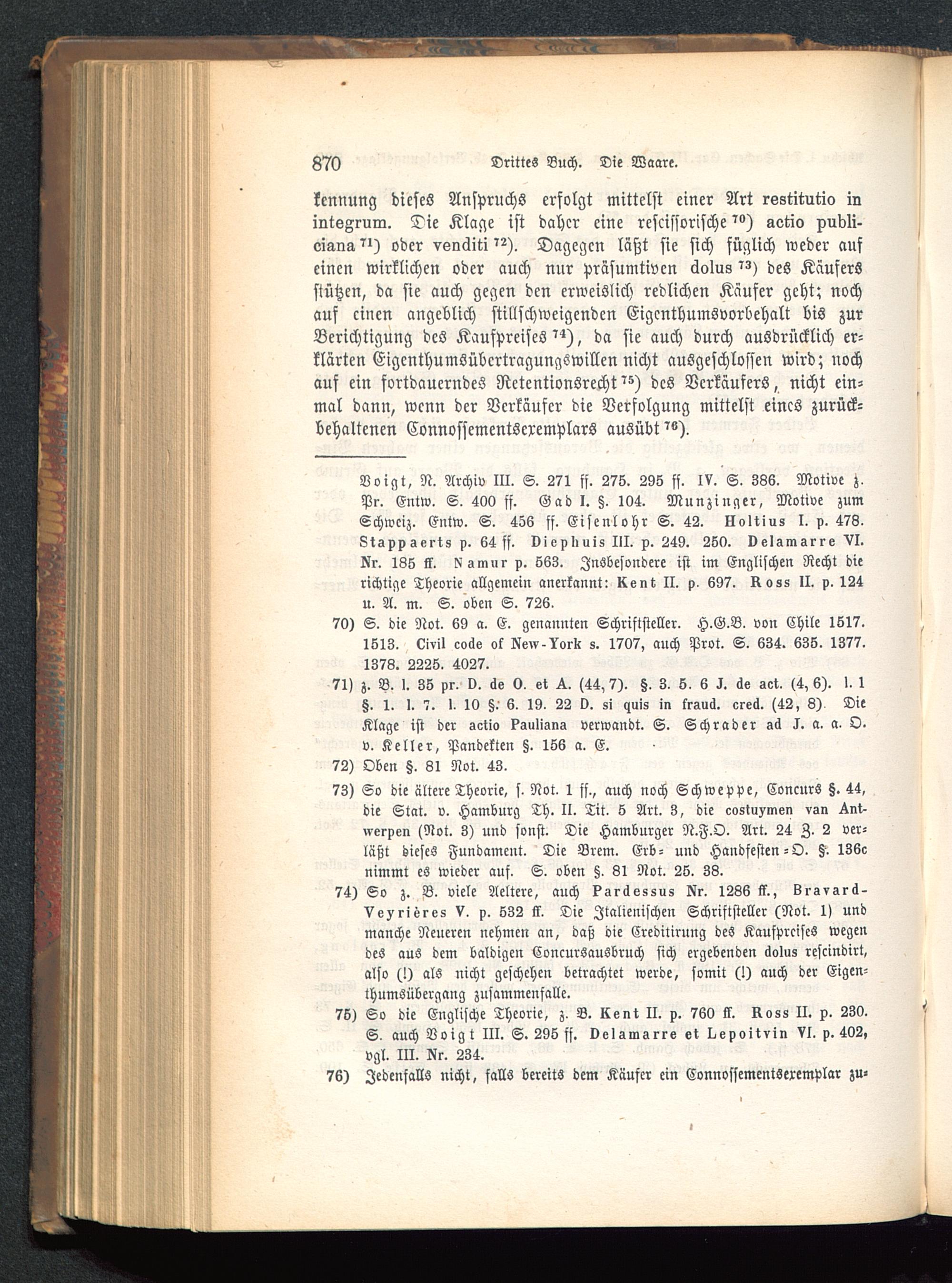 kennung dicseö Anspruchs erfolgt mittelst einer Art rgZtitutio inilltöArum. Die Klage ist daher eine rescissorische aotio xubli-oig-llÄ^l) oder venäiti'2). Dagegen läßt sie sich füglich weder aufeinen wirklichen oder auch nur präsumtivcn äolus ^) des Käufersstützen, da sie auch gegen den erweislich redlichen Käufer geht; nochauf einen angeblich stillschweigenden Eigenthumsvorbehalt bis zurBerichtigung dcö Kaufpreises"), da sie auch durch ausdrücklich er-klärten EigenthumSübcrtragungSwillen nicht ausgeschlossen wird; nochauf ein fortdauerndes NetentionSrecht^) des Verkäufers, nicht ein-mal dann, wenn der Verkäufer die Verfolgung mittelst eines zurück-behaltenen Connossementscremplars ausübt