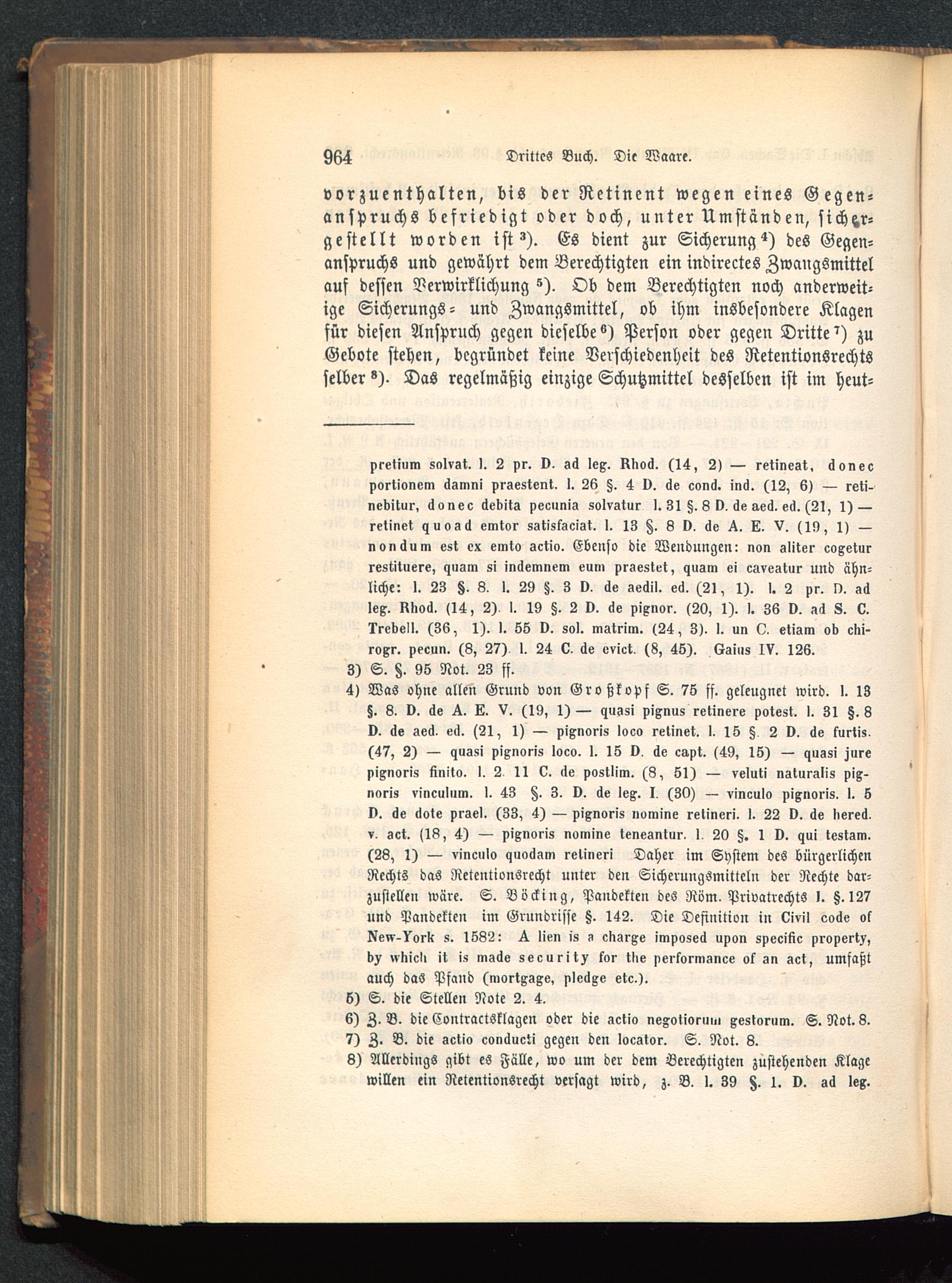 4> Was ohne allen Grund von Großkopf S. 75 ff. geleugnet wird. I. 13§. 6. 0. äe ^. L. V. (19, 1) — qussi pixnus retinere potest. I. 31 z. 8v. äe seil. e<i. (21, 1) — pixnoris loco retinet. I. 15 § 2 v. äs kurlis(47, 2) — oussi pixnoris loco. I. 15 v, cle capt. (49, 16) — c>ussi jurepixnoriz tinito. I. 2 II v. äs postlim. (3, 61) — veluti nsturslis pix-nnris vinculum. I. 43 §. 3. I>. äe lex. I (3l>) — vinculo pixnoris. I. 5O. äe clote prsel. (33, 4) — pixnori8 »omine retineri. I. 22 l). äe Iiereii.v. sct. (18, 4) — pixnoris nomine tenesntur. I 20 §. 1 v. c>ui testsm.(23, 1) — vinculo quaäsm retineri Daher im System des bürgerlichenRechts das Retentionsrecht unter den Sicheruugsmitteln der Rechte dar-zustellen wäre. S. Böcking, Paudekten des Rom . Privatrechts I. §.127und Pandekten im Grundrisse §. 142. Die Definition in vivil ooäe okkiew-Vvrk «. 1582: ^ lien is ?> cksrxe imposeä upon specikc propertv,bv ul>ic!> it is mscke seouritv 5or tbe perkormsnce ok sn svt, umfaßtauch da« Pfand (mortxsxe, plväxs etc.).