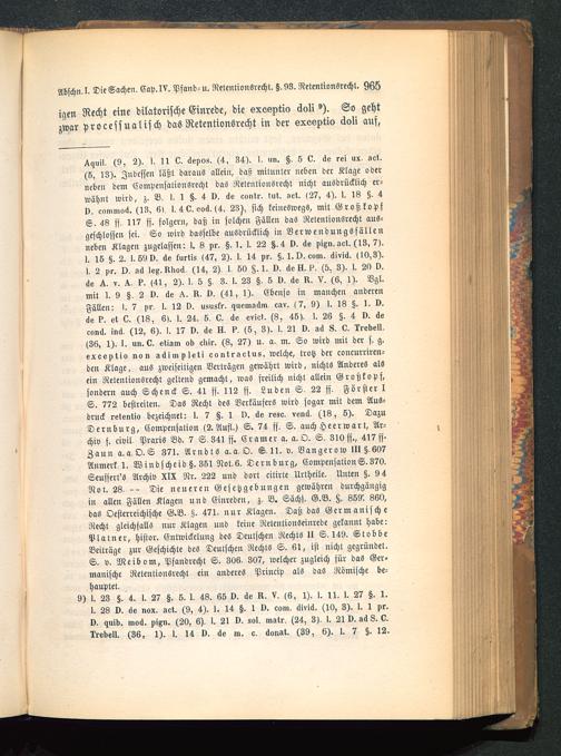 ^qui>, (9, 2). >> II e. ckepos. l4, 34). >, »n. §, 5 e, <>e rei ux, sct.(6, 13). Indessen läßt daraus allein, daß mitunter neben der Klage oderneben dem Compensalionsrecht das Retentionsrecht nicht ausdrücklich er-wähnt wird, z. B, I. I §, 4 v. cke contr. tut. sct. «27, 4). I. 18 §. 4I). cnmmock. (13, 6> I. 4 V. eock, (4> 23), sich keineswegs, mit Groß köpfS. 48 ff. 117 ff. folgern, daß in solchen Fällen das Netenlionsrcchl aus-geschlossen sei. So wird dasselbe ausdrücklich in Verwendungsfällcnneben Klagen zugelassen: I. 8 pr, Z. 1. I. 22 §.4 0. cke pixn. sct. (13, 7>.I. 16 §. 2. I. 69 0. cke kurtis «47, 2). 1. 14 pr. §. I.v. com. ckivick. l>0,3).I. 2 pr. 0, sck lex.klwck (14, 2) > 60 8-1. v. cke L. (6, 3). I. 2N 0.cke v. ?. <41, 2). I. 5 §, 3. I. 23 §. 5 0. cke k. V. (6, I). Vgl.mit 1. 9 §, 2 v. cke ^. k. 0. (41, 1). Ebenso in manchen anderenFällen: >. 7 pr, I. 12 v. ususkr. quemsckm csv. l7, 9) I. 18 §. I. 0.cke ?. et c. (13, 6». I. 24. 6, v. cke evict. (g, 46), I. 26 §. 4 v. ckeconck. inck, (12, 6). I. 17 0. cke L, ?. (6, 3). I. 21 0. sck 8. v. Irebell,(36, 1). I. un. v. et!sm ob cllir. (8, 27) u. a. m. So wird mit der s. g.exceptio non sckiinpleti contrsctus, welche, trotz der concurriren-den Klage, aus zweiseiligen Verträgen gewährt wird, nichts Anderes alsein Retentionsrecht geltend gemacht, was freilich nicht allein Großkopf,sondern auch Schenck S. 41 ff. 112 ff. Luden S. 22 ff. Förster IS. 772 bestreilen. Das Recht des Verkäufers wird sogar mit dem Aus-druck retentio bezeichnet: I. 7 §. 1 0. cke resc, venck, (13, 6). DazuBern bürg, Compensation (2. Aufl.) S. 74 ff. S. auch Heer wart, Ar-chiv f. civil, Praxis Bd. 7 S, 341 ff. Cramer a. a. O. S. 310 ff., 417 ff-Zaun a.a O.S 371. Arndts a.a.O. S.II. v. Vangerow III § 607Anmerkl. Windscheid H. 381 Not.6. Dernburg, CompensationS.370.Seusfert's Archiv XIX Nr. 222 und dort citirte Urtheile. Unten §.94Not. 28, -- Die neueren Gesetzgebungen gewähren durchgängigin allen Fällen Klagen und Einreden, z, B. Sächs. G.B. §. 659'. 360,das Oestcrrcichische G.B. §. 471. nur Klagen. Daß das GermanischeRecht gleichfalls nur Klagen und keine Retentionseinrede gekannt habe:Platner, histor. Entwickelung des Deutschen Rechts II S. 149. StobbeBeiträge zur Geschichte des Deutschen Rechts S. 61, ist nicht gegründet.S. v. Meibom, Pfandrecht S. 306, 307, welcher zugleich für das Ger-manische Retentionsrecht ein anderes Princip als das Römische be-hauptet,