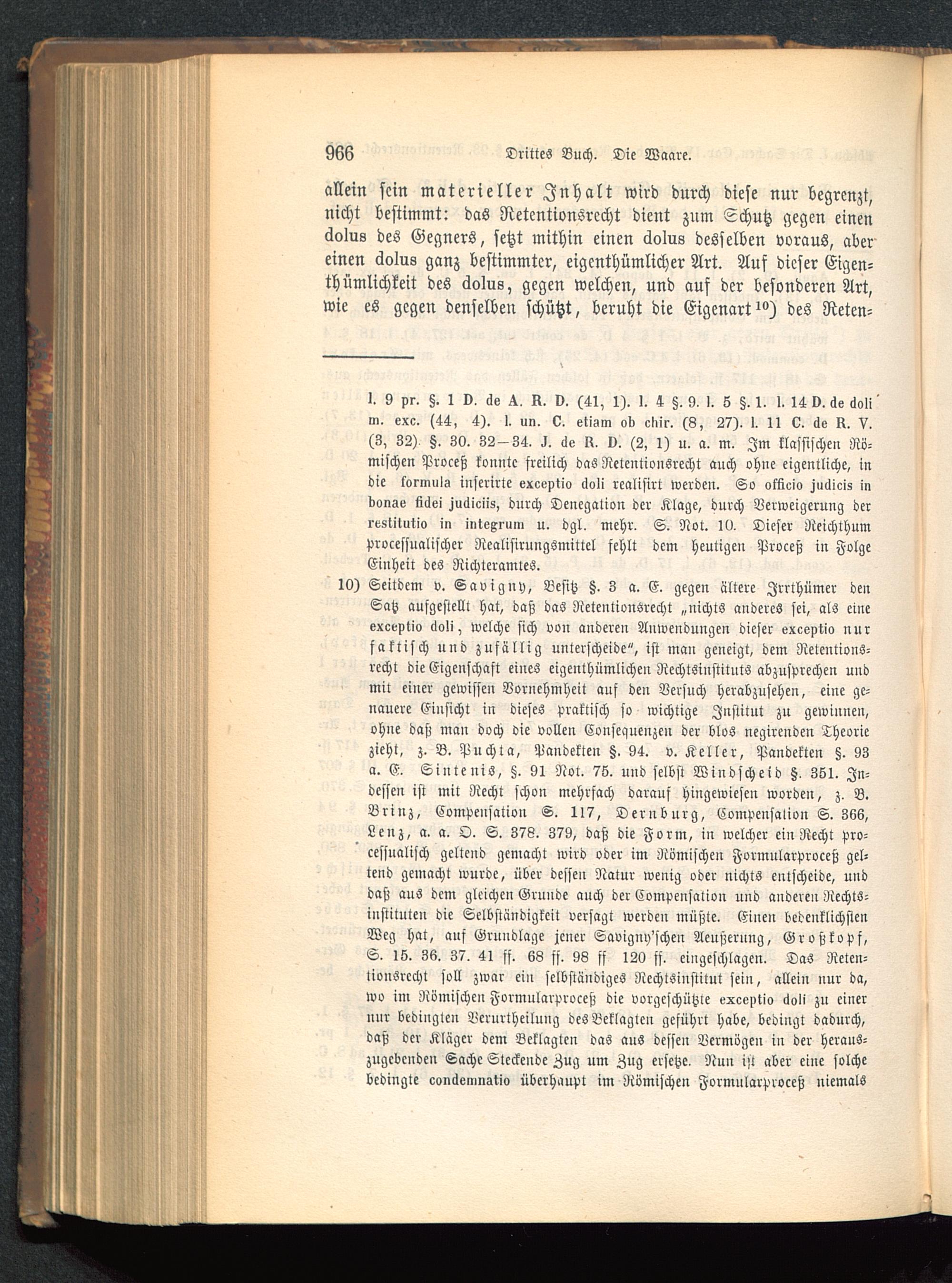 I. 9 pr. §. I o. <Ze 4. k. v. (41, 1). I. 4 §. 9. I. 5 §. 1. I. 14 o. Se doli'm. exc. (44, 4). I. un. v. etigm ob cliir. (8, 27). I. 11 L. 6e k. V.(3, 32), §. 30. 32-34. ^. <Iv k. 0. (2, 1) u. a. m. Im klassischen Rö-mischen Proceß konnte freilich das Nctentionsrecht auch ohne eigentliche, indie kormnis inserirte exceptio äoli realisirt werden. So oküeio judicis indonsv üilei juiliciis, durch Denegation der Klage, durch Verweigerung derrestitutio in intexruin u. dgl. mehr. S. Not. ll>. Dieser Reichthumprocessualischcr Realisirungsmittel fehlt dem heutigen Proceß in FolgeEinheit des RichteramleS.10) Seitdem v. Savigny , Besitz K. 3 a. E. gegen ältere Irrthümer denSatz aufgestellt hat, daß das NetentionSrecht „nichts anderes sei, als eineexceptio cioli, welche sich von anderen Anwendungen dieser exceptio nurfaktisch und zufällig unterscheide", ist man geneigt, dem NetentionS-recht die Eigenschaft eines eigenthümlichen Rechtsinstituts abzusprechen undmit einer gewissen Vornehmheit auf den Versuch herabzusehen, eine ge-nauere Einsicht in dieses praktisch so wichtige Institut zu gewinnen,ohne daß man doch die vollen Consequenzeu der blos negirenden Theoriezieht, z. B. Puchta, Pandekten §. 94. v. Keller, Pandekten §. 93a. E. Sinteniö, §. 91 Not. 7S. und selbst Windscheid z. 361. In-dessen ist mit Recht schon mehrfach darauf hingewiesen worden, z. B.Brinz, Eomvensation S. 117, Deruburg, Comvensalion S. 366,Lenz, a. a. O. S. 378. 379, daß die Form, in welcher ein Recht pro-cessnalisch gellend gemacht wird oder im Römischen Formnlarproceß gel-tend gemacht wurde, über dessen Natur wenig oder nichts entscheide, unddaß aus dem gleichen Grunde auch der Compensalion und anderen Rechts-institulen die Selbständigkeit versagt werden müßte. Einen bedenklichstenWeg hat, auf Grundlage jener Savigny'schen Aenßernng, Groß köpf,S. IS. 36. 37. 41 ff. 63 ff. 98 ff 120 ss. eingeschlagen. Das Reten-lionsrccht soll zwar ein selbständiges NechtSinstilut seiu, allein nur da,wo im Römischen Formnlarproceß die vorgeschützte exceptio e!c>>i zu einernur bedingten Pcrnrtheilung des Beklagten geführt habe, bedingt dadurch,daß der Kläger dem Beklagten das aus dessen Vermöge» in der heraus-zugebenden Sache Steckende Zug um Zug ersetze. Nun ist aber eine solchebedingte conäemiistio überhaupt im Römischen Formularproceß niemals