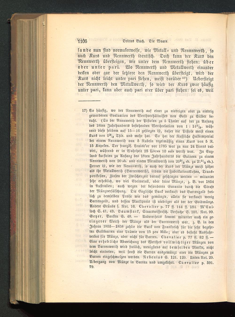 17) So häufig, wo der Ncnuwerth auf einer zu niedrigen oder zu niedriggewordenen Evaluation des Wcrthvcrhältuisscs von Gold zu Silber be-ruht. (So der Ncnnwcrth der Pistolen zu S Thaler auf der zu Anfangdes I8tcn Jahrhundert« bestehenden Werlhrclalion von 1 : 14'/,, wäh-rend diese seitdem auf 15—16 gcsticgcu ist, daher die Pistole meist einenKurS von S^/z Thlr. und mehr hat. So hat der Russische Halbimperialbei einem Ncnnwcrth von S Nubcln regelmäßig einen Kurs von S R.15 Kopeken. Der franzos. Louiöd'or vor 1735 war zu nur 24 Livres val-virt, während er in Wahrheit 25 I-iviez ll) sols werth war. In Eng-land knrsirten zu Anfang des 18lcn Jahrhunderts die Guineen zu einemNennwert!) von 20 sli. und einem MelaUwcrlh von 20^/, sli. zu 2l^!, sl>.).Ferner ist, wie der Ncnnwcrth, so auch dcr Kurs dcr Münze meist höherals ihr Mctallwerth (Barrcnwcrth), indem die Fabrikationskosten, TranS-portkostcn, Zinsen dcr Zwischenzeit darauf geschlagen werden — mituntersehr erheblich, wo vicl Edelmetall, aber keine Münze, z. B. vor 1854in Australien ; anch wegen dcr besonderen Garantie durch die Strafedcr Münzvcrsälschung. Die Englische Bank verkauft das Barrengold frei-lich zu demselben Preise wie das gemünzte, allein sie verkauft wenigBarrengold, nud dessen Marktpreis ist niedriger als dcr dcr Goldmünze.Andere Gründe s. Not. 10. ci.evslivr p. 77 ff, 144 ff. 184, M'Cul-loch S. 41. 43. Baumstark, StaatSwisscnsch. Versuche S. 101. Not. 99.Geyer, Banken S. 48. — Andererseits kommt mitunter auch eiu ge-ringerer Werth dcr Münze als dcr Barrcnwcrth war, z. B. in denJahren 1855—1353 zahlte die Bank von Frankreich für die sehr begehr-ten Goldbarren eine Prämie von 15 pro Mlv; oder es besteht Ausfuhr-verbot für Müuze, aber nicht für Barren, vlievslier p. 77 ff. 32 ff.—Eine erhebliche Abweichung des Werthes vollwichtiger Münzen vonocm Barrenwcrth wird freilich, wenigstens auf demselben Markte, nichtleicht eintreten, weil sonst die Barren ausgemünzt oder die Münzen zuBarren ciiigcschmolzcn werden, NebcniuS S. 121. 129, Unten Not. 29.Ucbcrgang von Münze in Barren und umgekehrt, vlievslier p. 591.79.