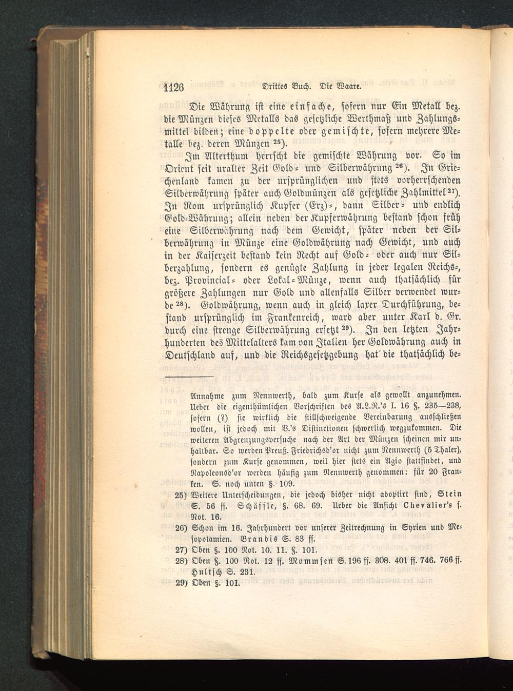 Annahme znm Nennwert!), bald zum Kurse als gewollt anzunehmen.Ueber die eigenthümlichen Vorschriften des A.L.R.'ö I. 16 H. 23S—23S,sofern (?) sie wirklich die stillschweigende Vereinbarung ausschließenwollen, ist jedoch mit V.'s Distinctionen schwerlich wegzukommen. Dieweiteren AbgrenzungSvcrsuche nach der Art der Münzen scheinen mir un-haltbar. So werden Preuß, Friedrichöd'or nicht zum Nennwcrth (6 Thaler),sondern znm Kurse genommen, weil hier stets ein Agio stattfindet, undNapolconSd'or werden häufig zum Nennwerth genommen: für 20 Fran-ken. S. noch unten §, 109.26) Weitere Unterscheidungen, die jedoch bisher nicht adoptirt sind, SteinS. 56 ff. Schäffle, §. 68. 69. Ueber die Ansicht vlievslier'z s.Not, 16.