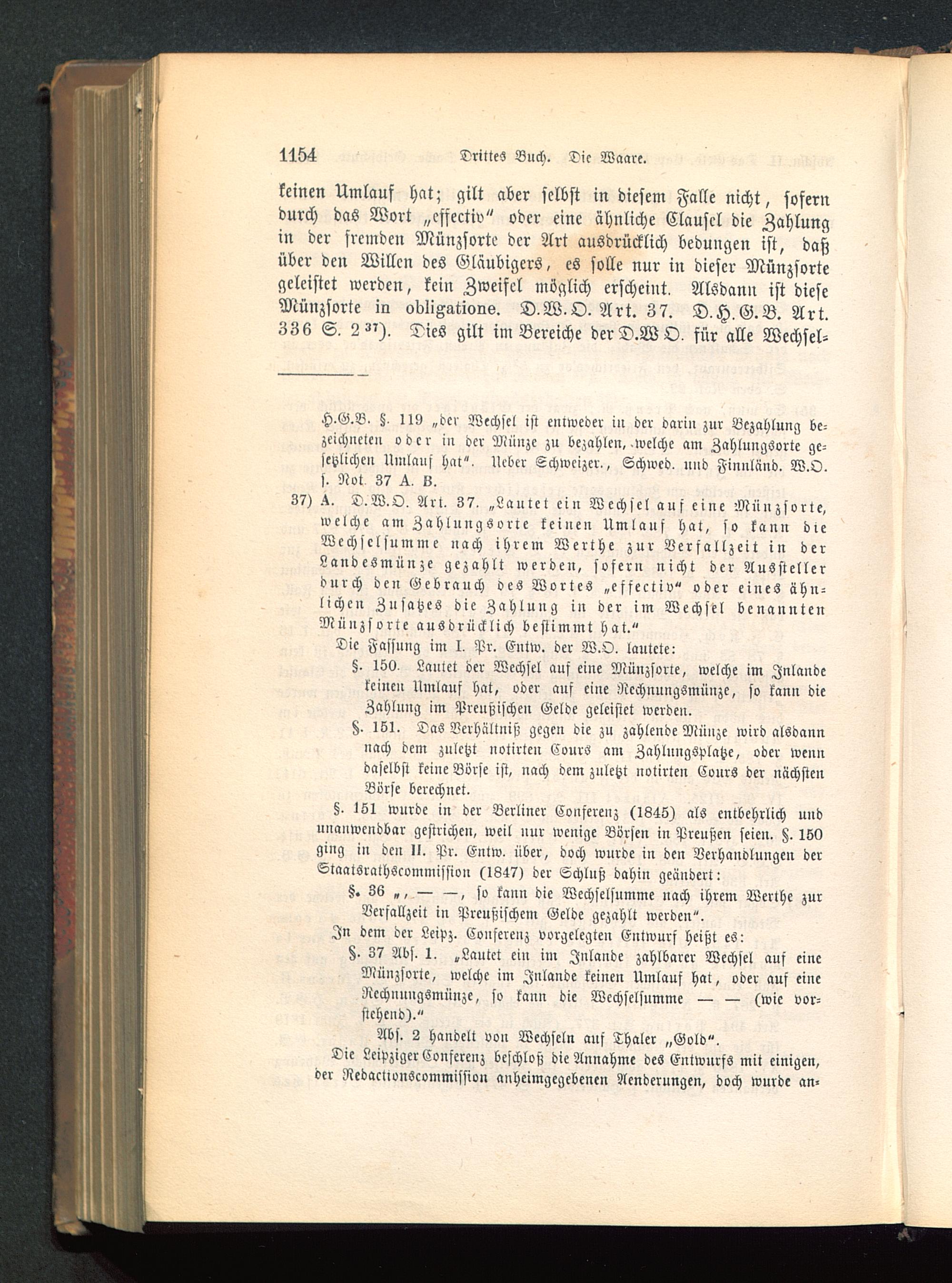 37) .4. D.W.O. Art. 37. „Lautet ein Wechsel aus eine Münzsorte,welche am Zahlungsorte keinen Umlauf hat, so kann dieWechsclsumme nach ihrem Werthe zur Verfallzeit in derLandesmünze gezahlt werden, sofern nicht der Ausstellerdurch den Gebrauch des Wortes „effectiv" oder eines ähn-lichen Zusatzes die Zahlung in der im Wechsel benanntenMünzsorte ausdrücklich bestimmt hat."Die Fassung im I. Pr. Entw. der W.O. lautete:§. 150, Lautet der Wechsel auf eine Münzsorle, welche im Jnlandekeinen Umlauf hat, oder ans eine Ncchnungsmnnze, so kann dieZahlung im Preußischen Gelde geleistet werden.§. 151. Das Verhältniß gegen die zu zahlende Münze wird alsdannnach dem znlctzt notirtcn Cours am ZahlnngSvlatzc, oder wenndaselbst keine Börse ist, nach dem zuletzt notirtcn Cours der nächstenBörse berechnet.