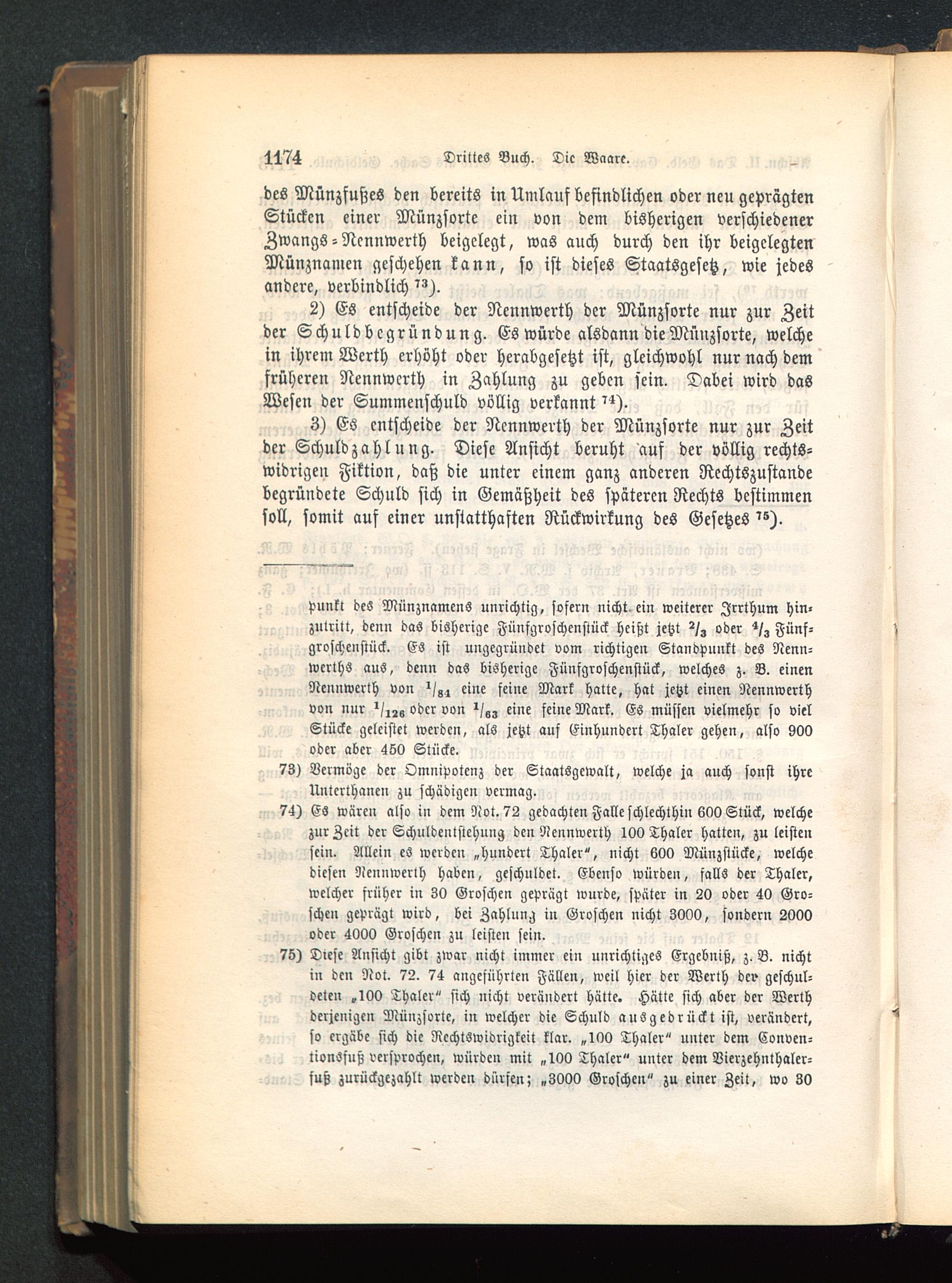 74) Es wären also in dem Not. 72 gedachten Falle schlechthin 600 Stück, welchezur Zeit der Schuldenlstchung den Nennwerth 100 Thaler hatten, zu leistensein. Allein es werden „hundert Thaler", nicht 600 Münzstücke, welchediesen Nennwert!) haben, geschuldet. Ebenso würden, falls der Thaler,welcher früher in 30 Groschen geprägt wurde, später in 20 oder 40 Gro-schen geprägt wird, bei Zahlung in Groschen nicht 3000, sondern 2000oder 4000 Groschen zu leisten sein.