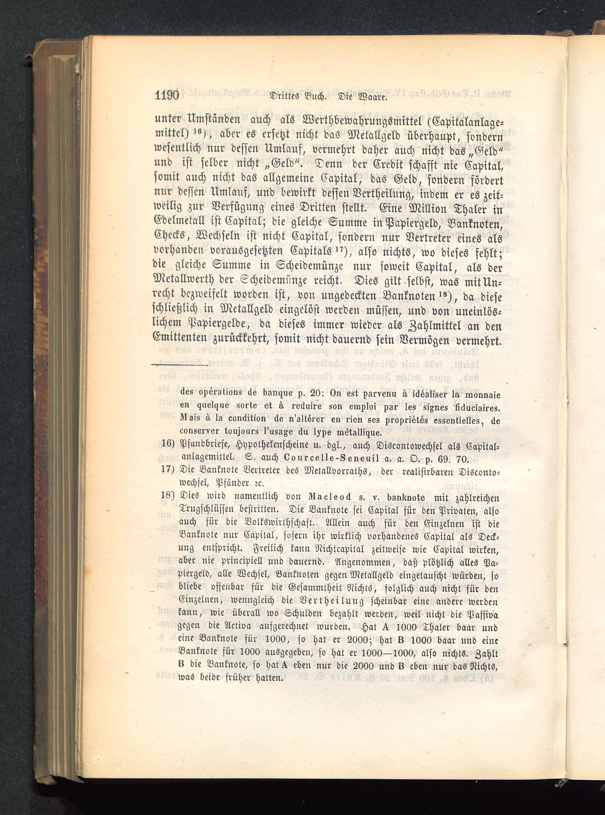 18) Dies wird namentlich von Zlacleoil s. v. bsnknote mit zahlreichenTrugschlüssen bestritten. Die Banknote sei Capital für den Privaten, alsoauch für die Volkswirthschaft. Allein auch für den Einzelnen ist dieBanknote »ur Capital, sofern ihr wirklich vorhandenes Capital als Deck-ung entspricht. Freilich kann Nichtcapital zeitweise wie Capital wirken,aber nie principiell und dauernd. Angenommen, daß Plötzlich alles Pa-piergeld, alle Wechsel, Banknoten gegen Metallgeld eingetauscht würden, sobliebe offenbar für die Gesammtheit Nichts, folglich auch uicht für denEinzelnen, wenngleich die Vcrtheilung scheinbar eine andere werdenkann, wie überall wo Schulden bezahlt werden, weil nicht die Passivagegen die Activa aufgerechnet wurden. Hat 1000 Thaler baar undeine Banknote für 1000, so hat er 2000; hat S 1000 baar und eineBanknote für 1000 ausgegeben, so hat er 1000—1000, also nichts. Zahltk die Banknote, so hat ^ eben nur die 2000 und v eben nur das Nichts,was beide früher hatten.