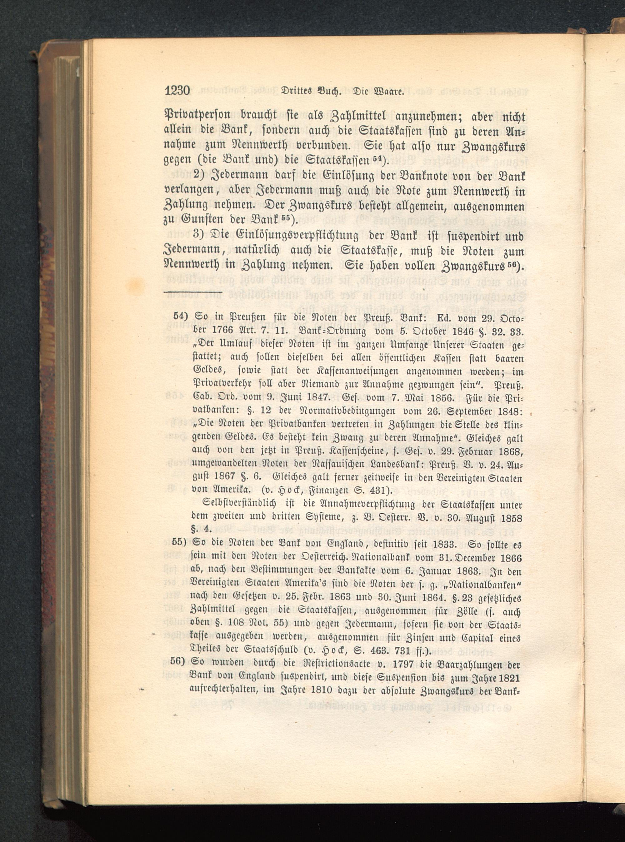64) So in Preußen für die Noten der Prcuß. Bank: La. vom 29. Octo-ber 1766 Art. 7. II. Bank-Ordnung vom 6. Oktober 1846 §. 32. 33.„Der Umlauf dieser Noten ist im ganzen Umfange Unserer Staaten ge-stattet; auch sollen dieselben bei allen öffentlichen Kassen statt baarcnGeldes, sowie statt der Kassenanweisungen angenommen werden; imPrivatverkehr soll aber Niemand zur Annahme gezwungen sein". Preuß.Cab. Ord. vom 9. Juni 1847. Ges. vom 7. Mai 1366. Für die Pri-vatbanken: §, 12 der Normativbedingungen vom 26. September 1843:„Die Noten der Privatbanken vertreten in Zahlungen die Stelle des klin-genden Geldes. Es besteht kein Zwang zu deren Annahme". Gleiches galtauch von den jetzt in Prcuß. Kassenscheine, s. Ges. v. 29. Februar 1663,umgewandelten Noten der Nassauischen Landesbauk: Preuß, V. v. 24. Au-gust 1867 §. 6. Gleiches galt ferner zeitweise in den Vereinigten Staaten von Amerika , (v. Hock, Finanzen S. 431).