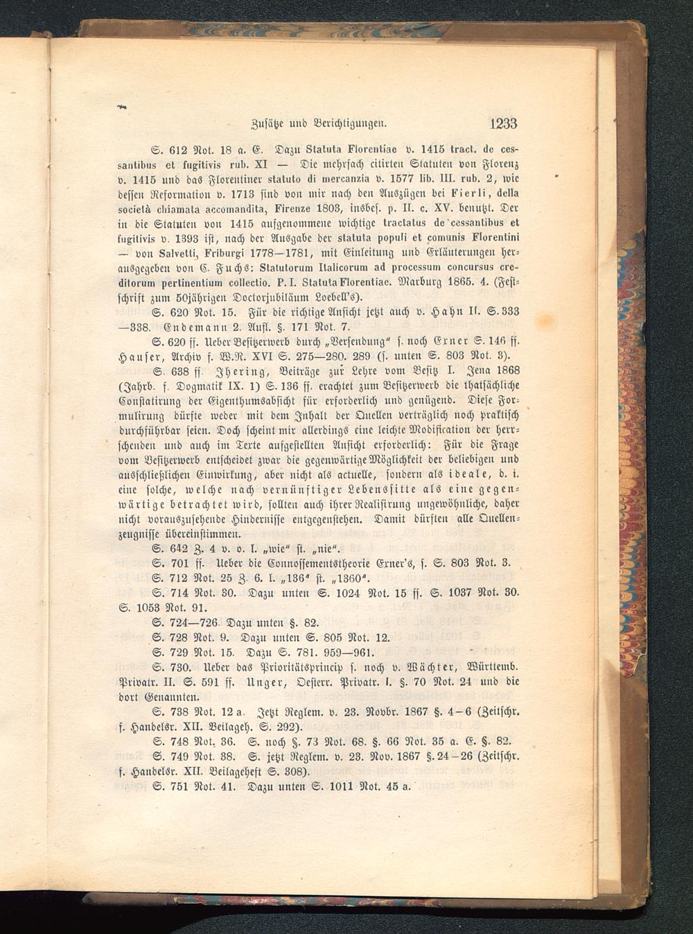 S. 612 Not. 13 a. E. Dazu Slgwt-i klvrenligv v. 1415 tracl. «le cos-ssutibu« et kuxitivis rud. XI — Die mehrfach citirteu Statute» vo» Florenz v. 1415 mid das Florentiner ststnto lli ,nerc»n?.is v. 1577 lib, III. rub. 2, wiedessen Reformation v. 1713 sind von mir nach den Auszügen bei ssieili, oellssocielS, cliiamals gcconi.inilit!,, ?iren?:s 1303, inSbcs. n. II. c. XV. benutzt. Derin die Statuten von 1415 aufgenommene wichtige tl-sct-ttuz de'cössi»>tik»5 etkuxitiviü v, 1393 ist, nach der Ausgabe der sistutg populi et comunis klorontini— von 8-iIveUi, ?rib»rxi 1778—1781, mit Einleitung und Erläuterungen her-ausgegeben von C Fuchs: Stslulvrum ltalicorum sä processnm concursuü cro-dilorum perlinentiiim collectiv. ?. I. Si»tut»?Ioi-eiit>Ao. Marburg 1365. 4. (Fest-schrift zum 50jährige» Doctorjnbiläum Locbcll's).