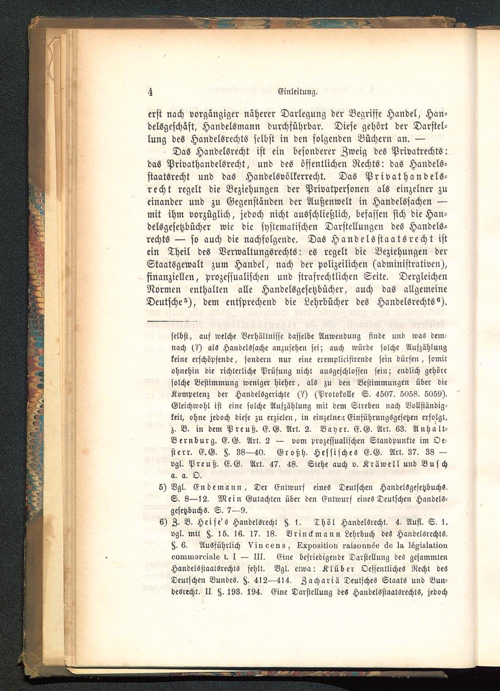 Das Handelsrecht ist ein besonderer Zweig des Privatrechts:das Privathandelsrecht, und des öffentlichen Rechts: das Handels-staatsrecht und das Handelsvölkerrecht. Das Privathandels-recht regelt die Beziehungen der Privatpersonen als einzelner zueinander und zu Gegenständen der Außenwelt in Handelssachen —mit ihm vorzüglich, jedoch nicht ausschließlich, befassen sich die Han-delsgesetzbücher wie die systematischen Darstellungen des Handels-rechts — so auch die nachfolgende. Das Handelsstaatsrecht istein Theil des Verwaltungsrechts: es regelt die Beziehungen derStaatsgewalt zum Handel, nach der polizeilichen (administrativen),finanziellen, prozessualischen und strafrechtlichen Seite. DergleichenNormen enthalten alle Handelsgesetzbücher, auch das allgemeineDeutsche5), dem entsprechend die Lehrbücher des Handelsrechts").