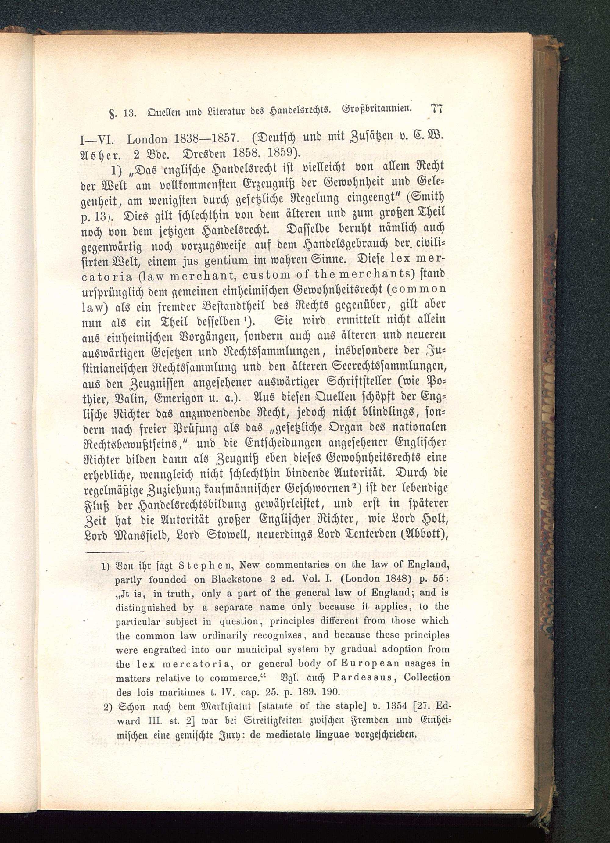 is, in trutki onl^ a pari ok tks Aönoral law c>t lZn^Ianä; anii isäistii>-;u!sliocl a separate name onl;' dseause it applies, to tkeparlicular sukiject in ^nestion, prineiplos äikkerent krom tliose vvliiclitks eorninon law orijinarilv reeoAnizes, an6 becauss tliess principlesvere engrakteci into our municipal System b)' Ara6ual acloption troratlie lex rnereatoria, or General boä)' oklZuropsan usaAes inraattvrs relative to eoromsrcs." Vgl. auch ?ar<Zessus, Lollection<Zes lois rnariliraes t. IV. cap. 25. p. 189. 19».