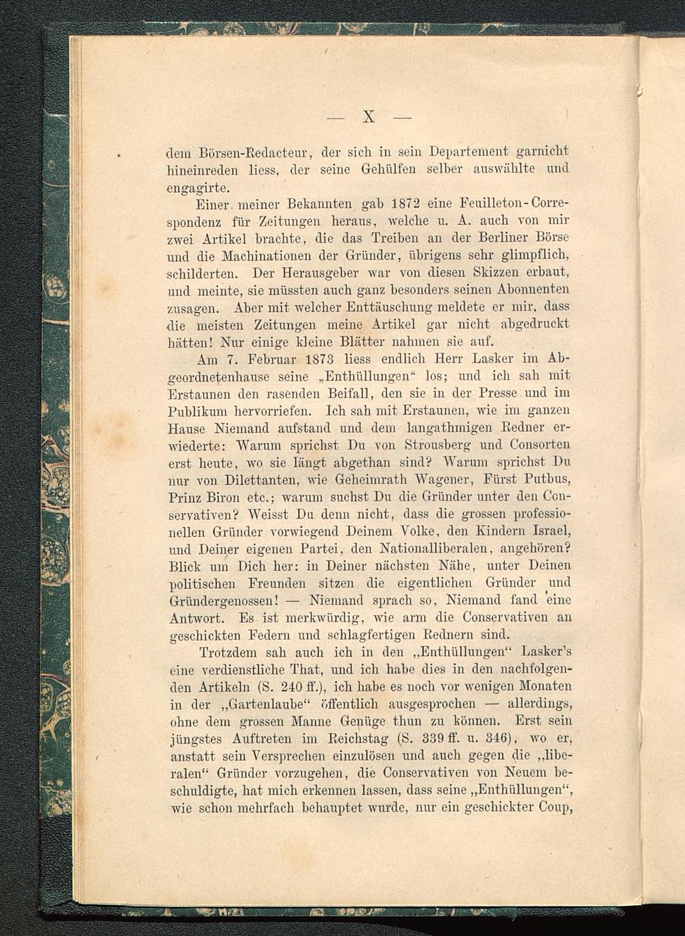 Am 7. Februar 1873 liess endlich Herr Lasker im Ab-geordnetenhause seine „Enthüllungen“ los; und ich sah mitErstaunen den rasenden Beifall, den sie in der Presse und imPublikum hervorriefen. Ich sah mit Erstaunen, wie im ganzenHause Niemand aufstand und dem langathmigen Redner er-weiterte: Warum sprichst Du von Strousberg und Consorteuerst heute, wo sie längt abgethan sind? Warum sprichst Dunur von Dilettanten, wie Geheimrath Wagener, Fürst Putbus,Prinz Biron etc.; warum suchst Du die Gründer unter den Con-servativen? Weisst Du denn nicht, dass die grossen professio-nellen Gründer vorwiegend Deinem Volke, den Kindern Israel,und Deiner eigenen Partei, den Nationalliberalen, angehören?Blick um Dich her: in Deiner nächsten Nähe, unter Deinenpolitischen Freunden sitzen die eigentlichen Gründer undGründergenossen! — Niemand sprach so, Niemand fand eineAntwort. Es ist merkwürdig, wie arm die Conservativen augeschickten Federn und schlagfertigen Rednern sind.