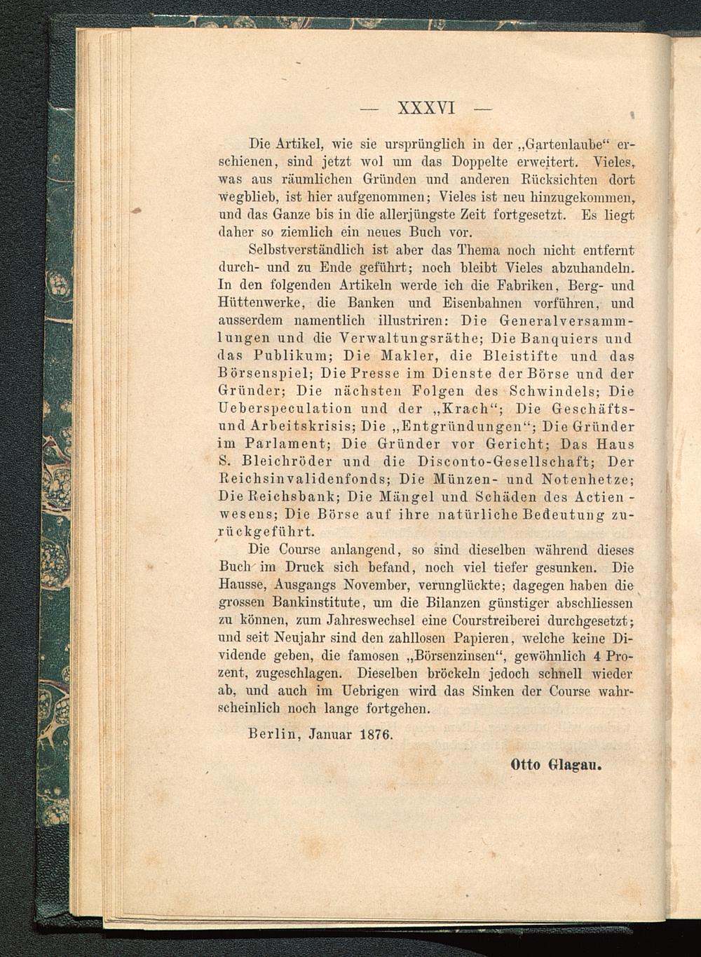Selbstverständlich ist aber das Thema noch nicht entferntdurch- und zu Ende geführt; noch bleibt Vieles abzuhandeln.In den folgenden Artikeln werde ich die Fabriken, Berg- undHüttenwerke, die Banken und Eisenbahnen vorführen, undausserdem namentlich illustriren: Die Generalversamm-lungen und die Verwaltungsräthe; Die Banquiers unddas Publikum; Die Makler, die Bleistifte und dasBörsenspiel; Die Presse im Dienste der Börse und derGründer; Die nächsten Folgen des Schwindels; DieUeberspeculation und der „Krach“; Die Geschäfts-und Arbeitskrisis; Die „Entgründungen“; Die Gründerim Parlament; Die Gründer vor Gericht; Das HausS. Bleichröder und die Disconto-Gesellscliaft; DerReichsinvalidenfonds; Die Münzen- und Notenhetze;Die Reichsbank; Die Mängel und Schäden des Actien-wesens; Die Börse auf ihre natürliche Bedeutung zu-rückgeführt.