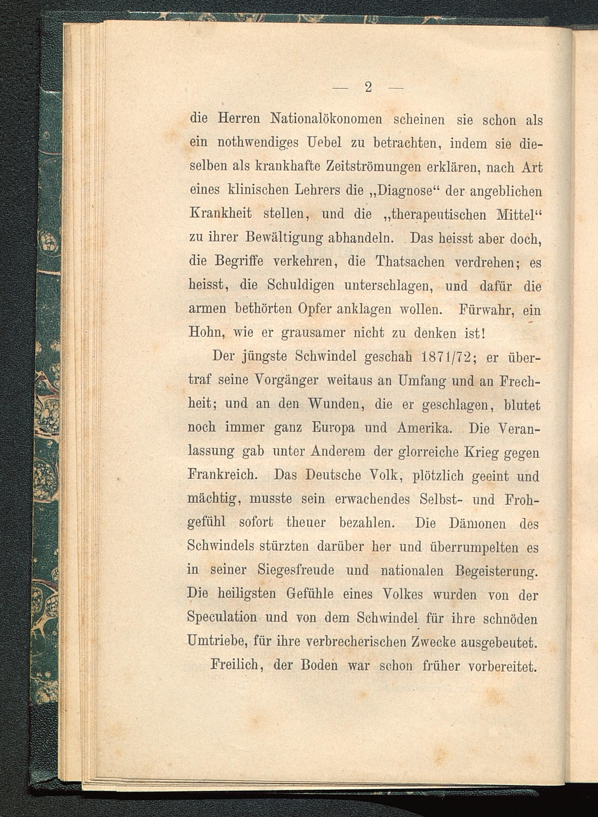 Der jüngste Schwindel geschah 1871/72; er über-traf seine Vorgänger weitaus an Umfang und an Frech-heit; und an den Wunden, die er geschlagen, blutetnoch immer ganz Europa und Amerika . Die Veran-lassung gab unter Anderem der glorreiche Krieg gegenFrankreich . Das Deutsche Volk, plötzlich geeint undmächtig, musste sein erwachendes Selbst- und Froh-gefühl sofort theuer bezahlen. Die Dämonen desSchwindels stürzten darüber her und überrumpelten esin seiner Siegesfreude und nationalen Begeisterung.Die heiligsten Gefühle eines Volkes wurden von derSpeculation und von dem Schwindel für ihre schnödenUmtriebe, für ihre verbrecherischen Zwecke ausgebeutet.
