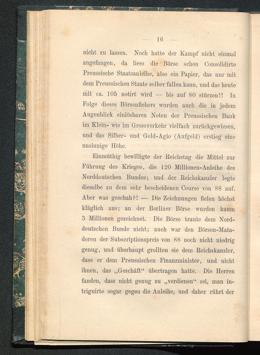 Einmüthig bewilligte der Keichstag die Mittel zurFührung des Krieges, die 120 Millionen-Anleihe desNorddeutschen Bundes; und der Reichskanzler legtedieselbe zu dem sehr bescheidenen Course von 88 auf.Aber was geschah?! — Die Zeichnungen fielen höchstkläglich aus; an der Berliner Börse wurden kaum3 Millionen gezeichnet. Die Börse traute dem Nord-deutschen Bunde nicht; auch war den Börsen-Mata-doren der Subscriptionspreis von 88 noch nicht niedriggenug, und überhaupt grollten sie dem Reichskanzler,dass er dem Preussischen Finanzminister, und nichtihnen, das „Geschäft“ übertragen hatte. Die Herrenfanden, dass nicht genug zu „verdienen“ sei, man in-triguirte sogar gegen die Anleihe, und daher rührt der