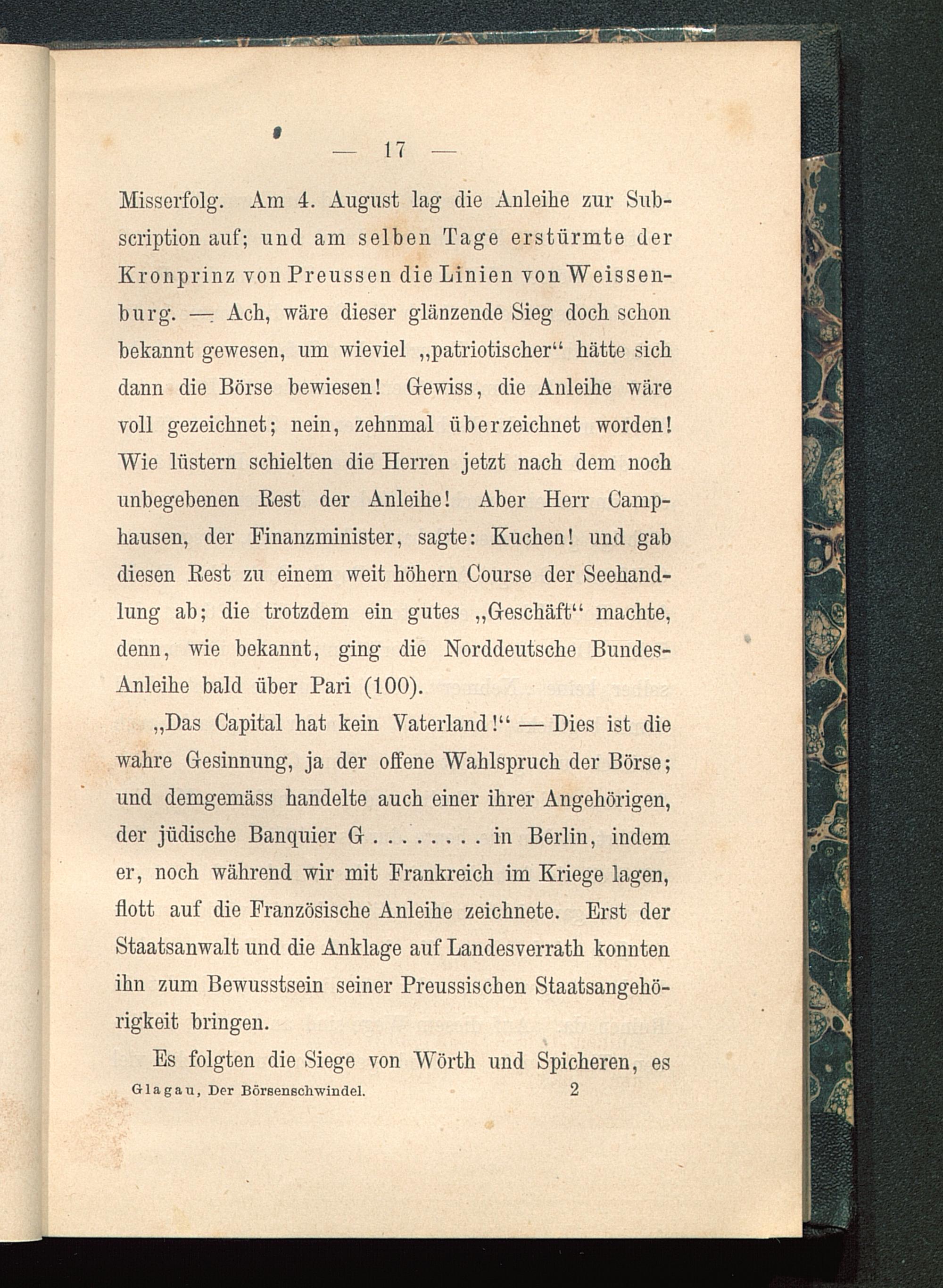 „Das Capital hat kein Vaterland!“ — Dies ist diewahre Gesinnung, ja der offene Wahlspruch der Börse;und demgemäss handelte auch einer ihrer Angehörigen,